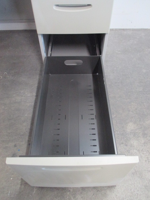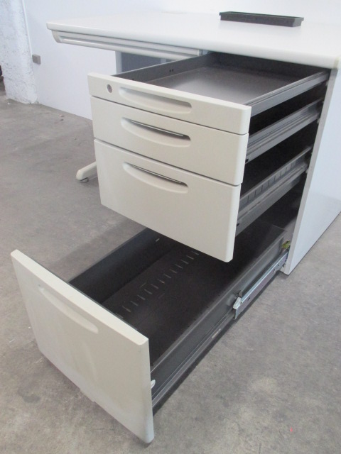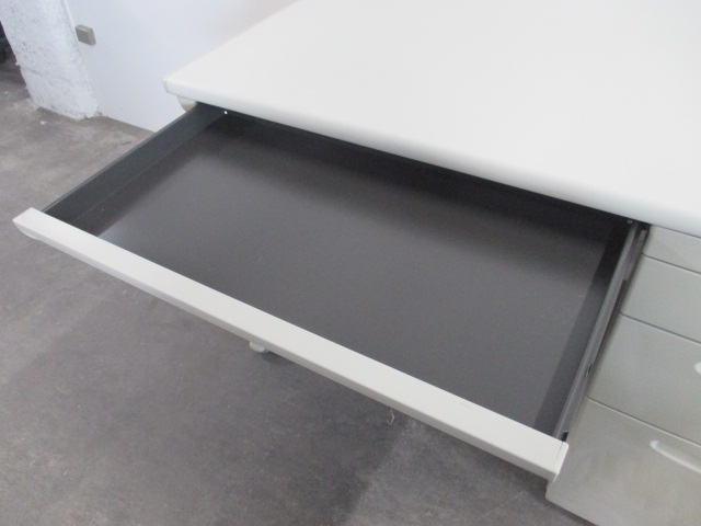 - 袖机のワゴンは、最下段がロング引出しになっており、従来より収納力120%アップ。