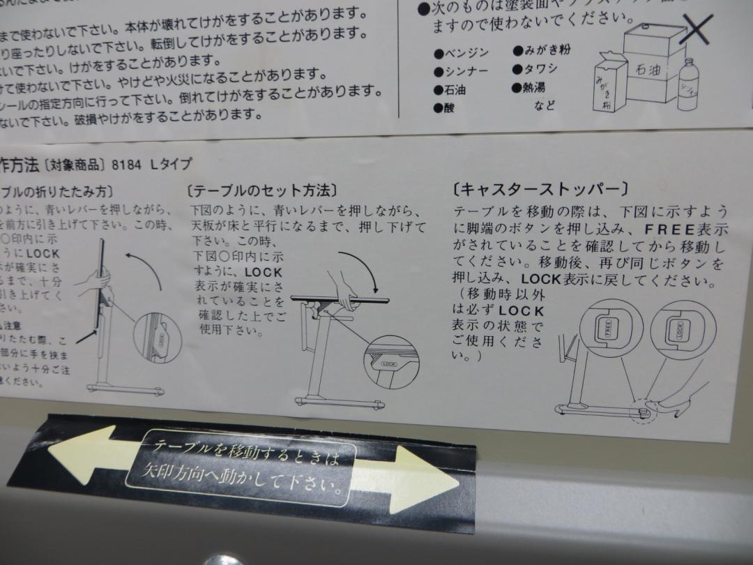 - 一部不具合あり天板歪み、アジャスター無し、キャスター使用不可ようなそのテーブルの本来の効用を果たすための機能以外の一部が使用不可な状態。(例、キャスターロッ ク機能使用不可、棚板無し等がある。)
