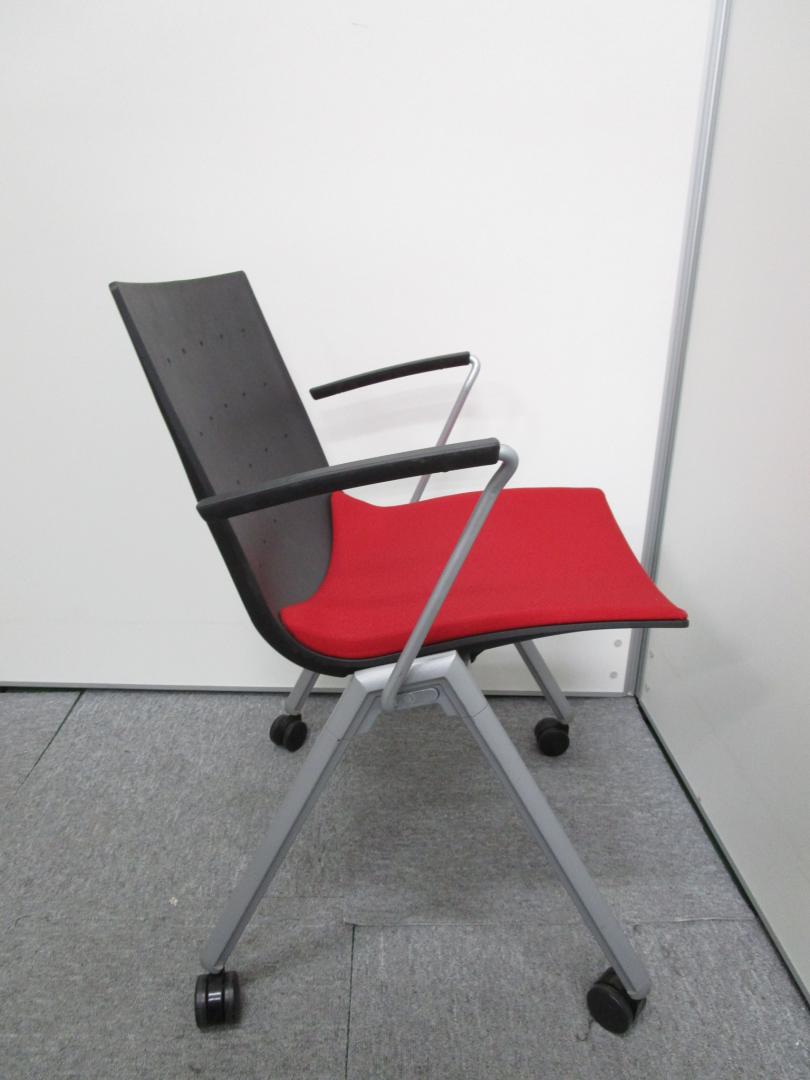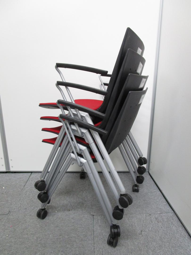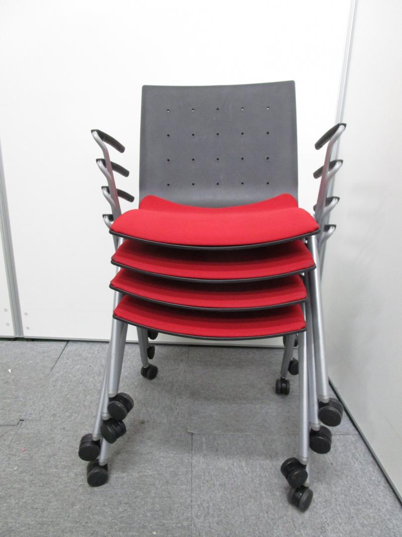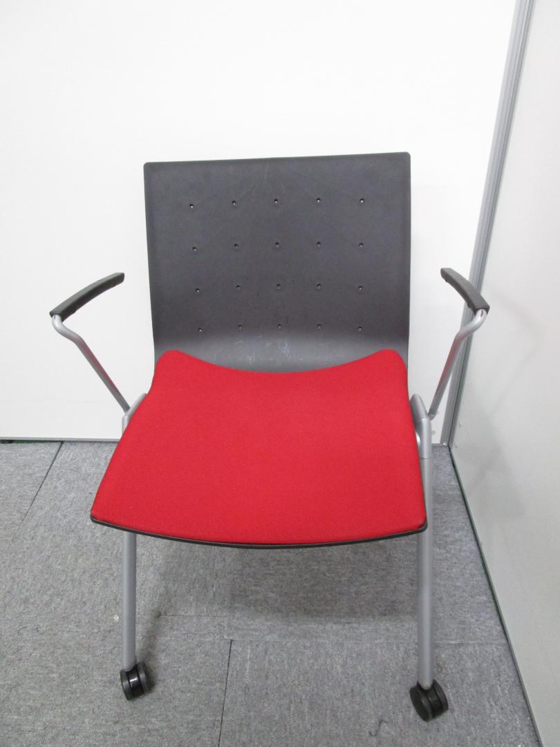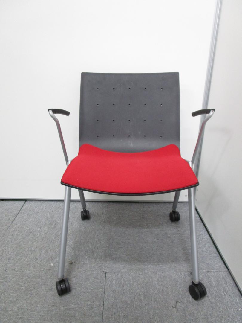 【内田洋行製 スタッキングチェア】■キャスター付き、肘付き ■背ヌードタイプ ■レッド&ブラック- 池袋店