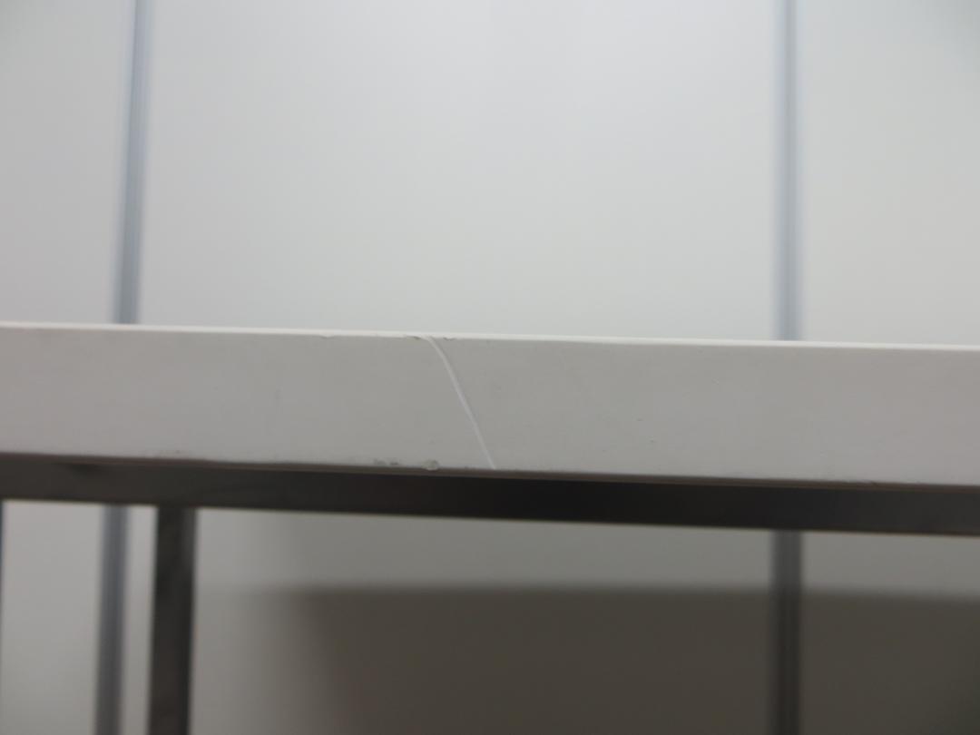 - 一部不具合あり天板歪み、アジャスター無し、キャスター使用不可ようなそのテーブルの本来の効用を果たすための機能以外の一部が使用不可な状態。(例、キャスターロッ ク機能使用不可、棚板無し等がある。)