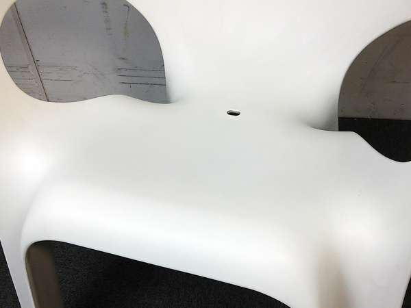 - かなり強い濃い黄ばみ・変色が商品全体にある。(例、座面・背もたれ、脚部等にある。)