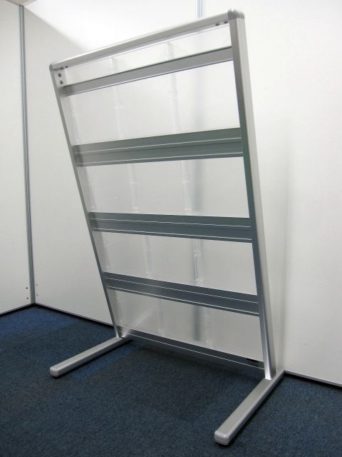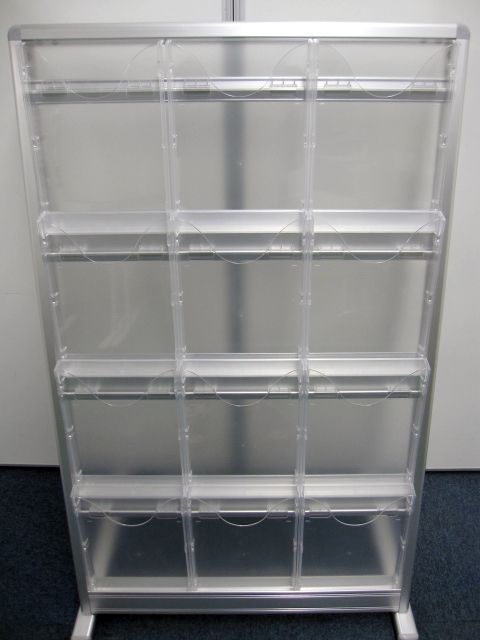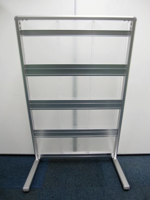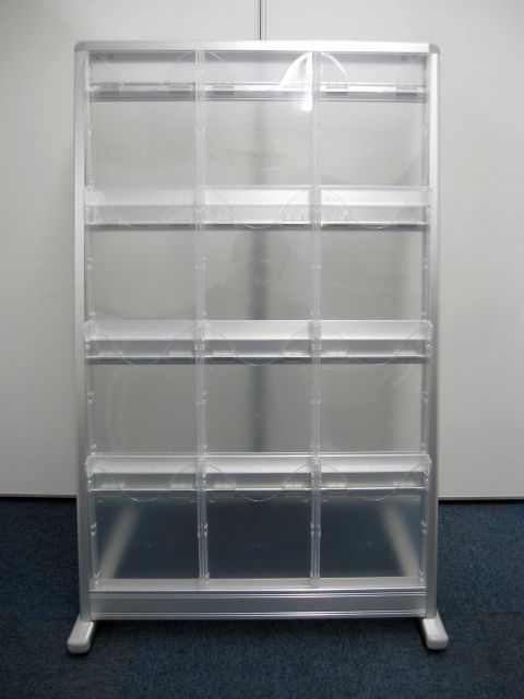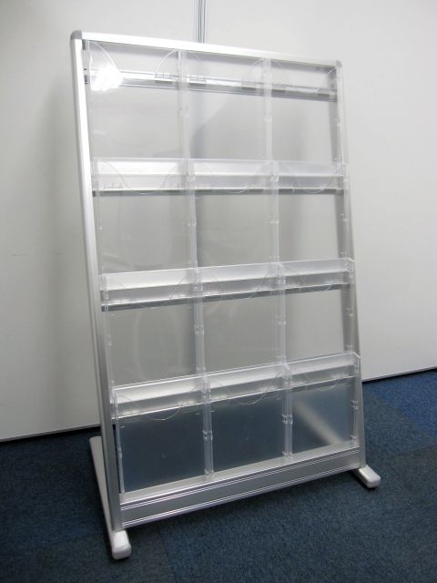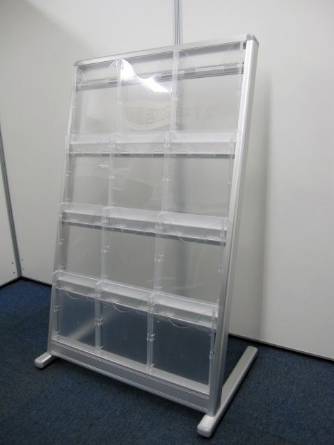 【パンフレットスタンド】カセット式パンフレットスタンド:ロータイプ(傾斜型)3列 美品 取り出しやすい型のクリアーカセットでオフィスをおしゃれに演出】【美品】- 品川・三田店