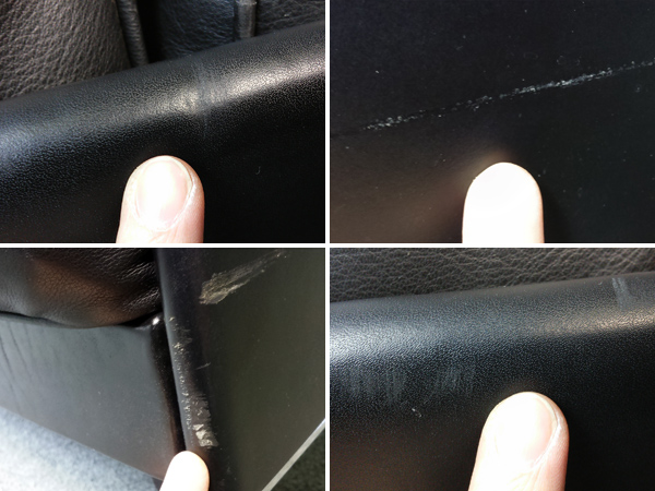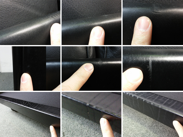 - 目立つ箇所複数ありソファの場合、深い破け、ホツレ、へたり、しわ等が多数ある。(例、背もたれ、肘かけ、座面等にある。)センターテーブルの場合、深い傷・凹みが商>品全体にある。(例、天板、脚にある。)