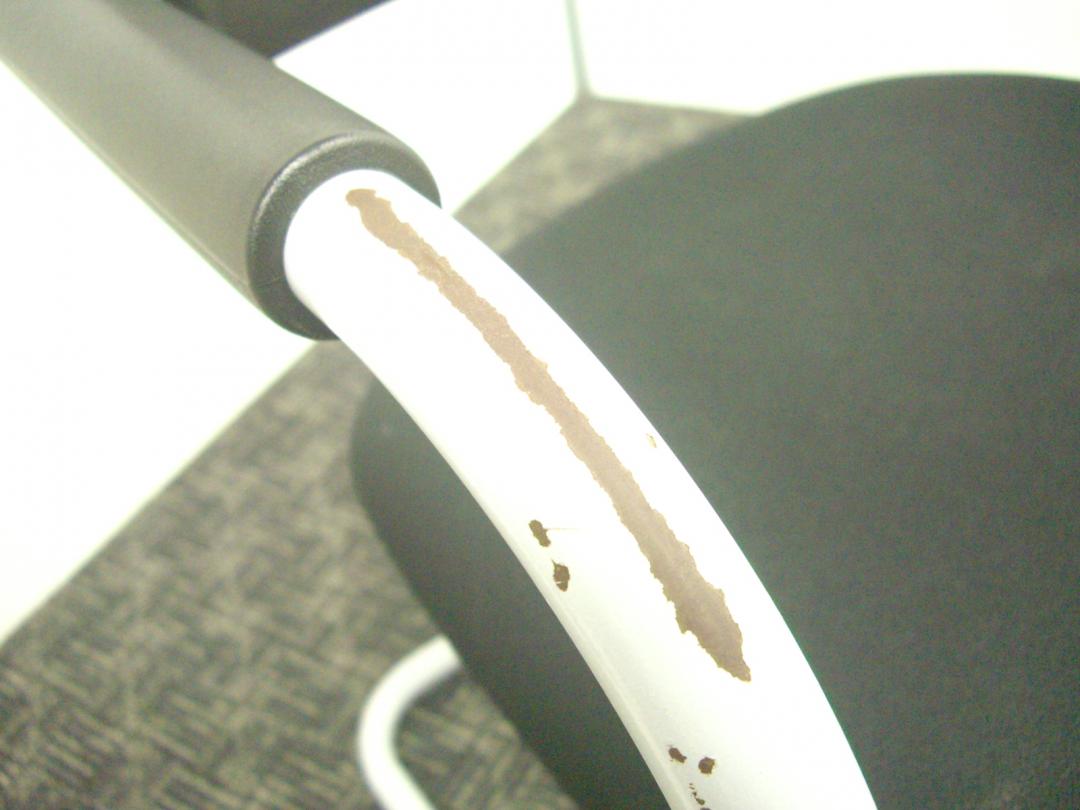 - かなり強い濃い黄ばみ・変色が商品全体にある。(例、座面・背もたれ、脚部等にある。)