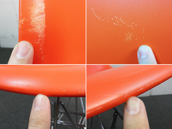 - 目立つ箇所あり傷・破れ・ほつれ・へたり・しわが多数または深い傷・破れ・ほつれ・へたり・しわが一部ある。※座面・背もたれ、シェル、脚部等にある。