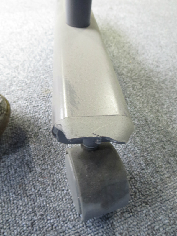 - 多数不具合あり天板歪み、アジャスター無し、キャスター使用不可ようなそのテーブルの本来の効用を果たすための機能以外の多数が使用不可な状態。(例、キャスターロッ ク機能使用不可、棚板無し等がある。)