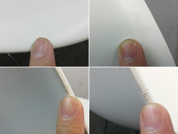 - かなり強い濃い黄ばみ・変色が商品全体にある。(例、座面・背もたれ、脚部等にある。)