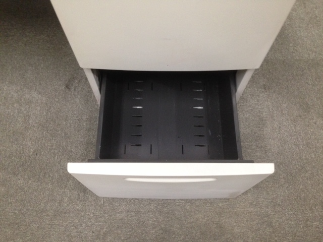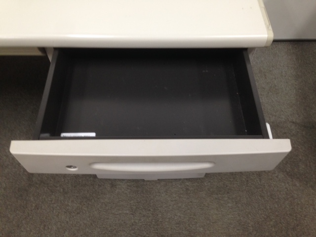 - 袖机のワゴンは、最下段がロング引出しになっており、従来より収納力120%アップ。