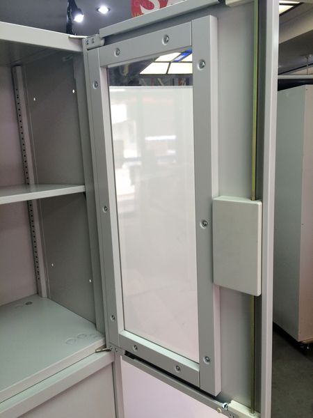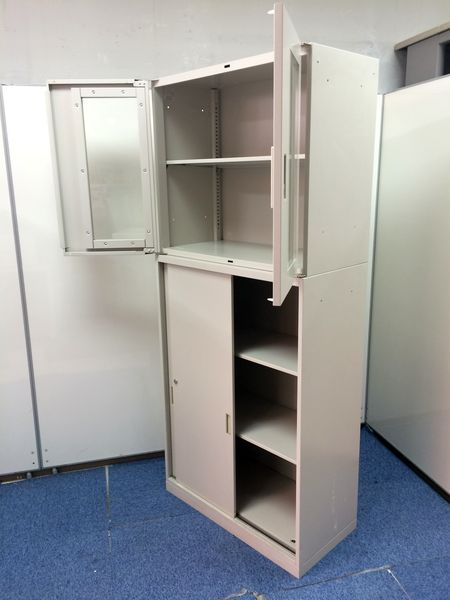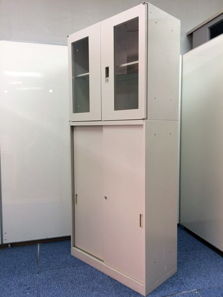 上:ガラス戸両開き棚3段、下:スチール引違い3段