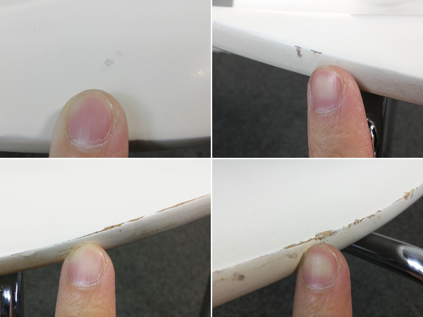 - かなり強い濃い黄ばみ・変色が商品全体にある。(例、座面・背もたれ、脚部等にある。)