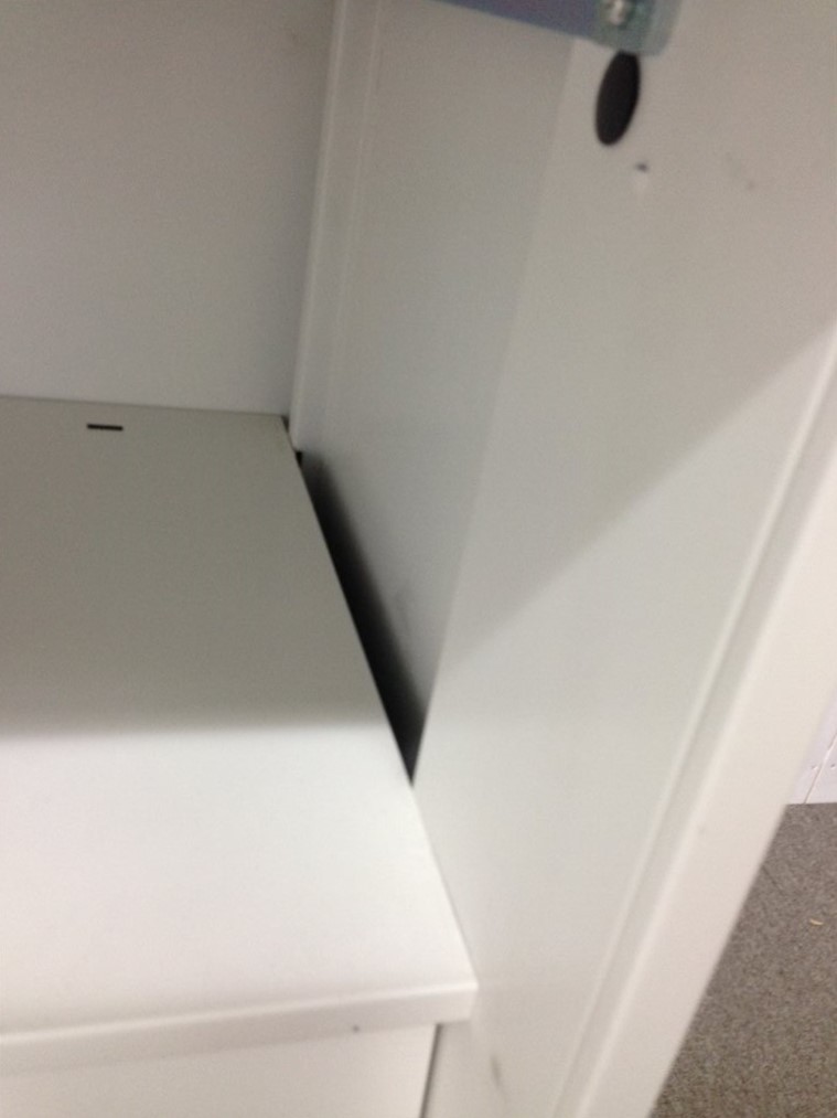 - 壊れている引出の開閉不可、施錠不可、棚板無しといったその書庫の本来の効用を果たすための機能に不具合がある(例、扉、引出の開閉が行えない。)