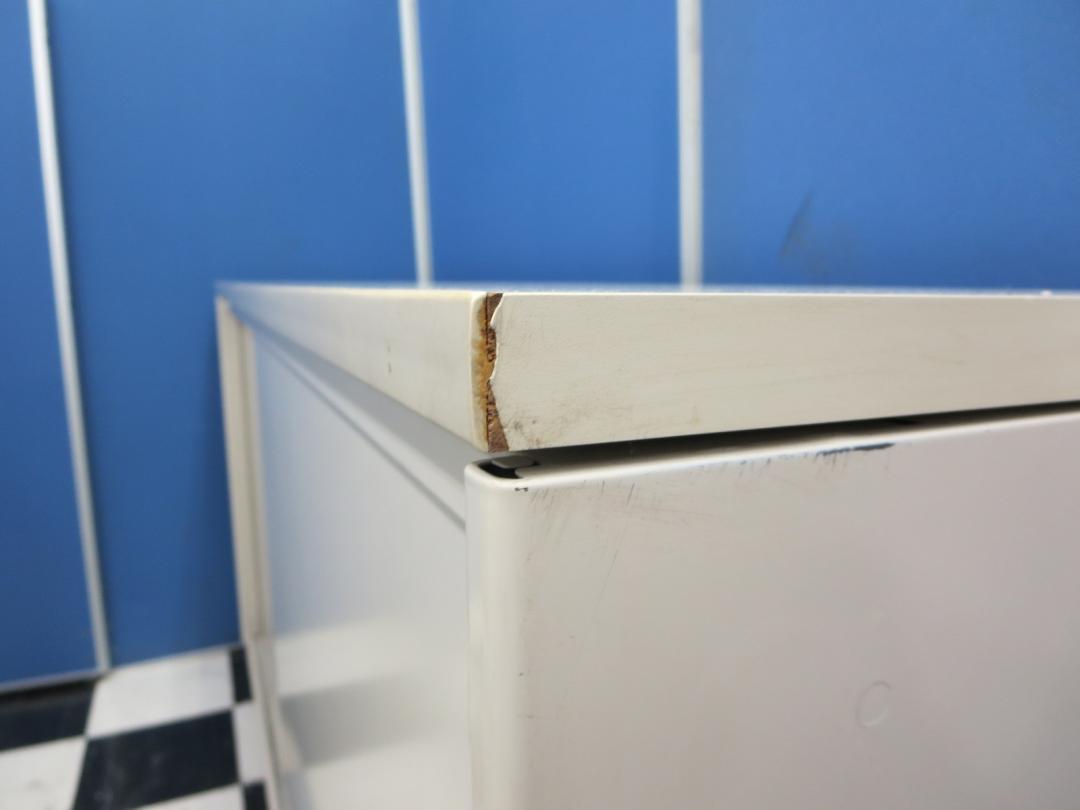 - 一部不具合あり天板歪み、引出開閉不可、アジャスター無し、施錠不可のようにそのカウンターの本来の効用を果たすための機能以外の一部が使用不可な状態。(例、引出が 開閉しづらい等がある。)