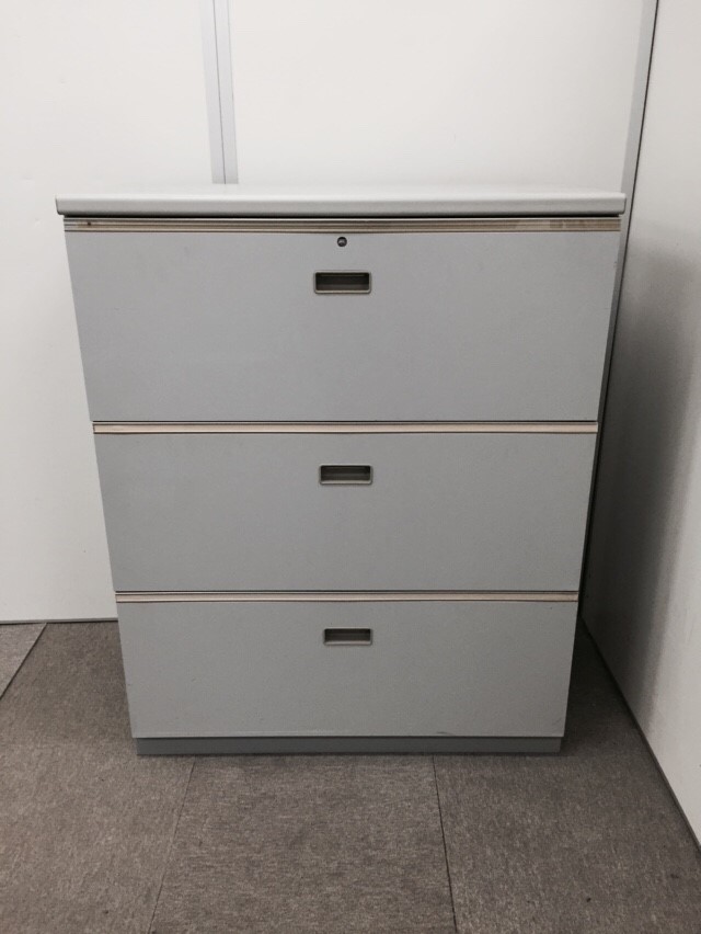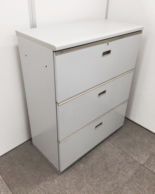 【書類をまとめて整理!引き出し式キャビネット】■イトーキ(ITOKI)製 シンラインシリーズ 3段ラテラル ニューグレー ※取っ手日焼けあり 《オフィスバスターズ福岡博多店は、福岡を拠点として、日本全国へ中古オフィス用品・オフィス家具を提供しております》