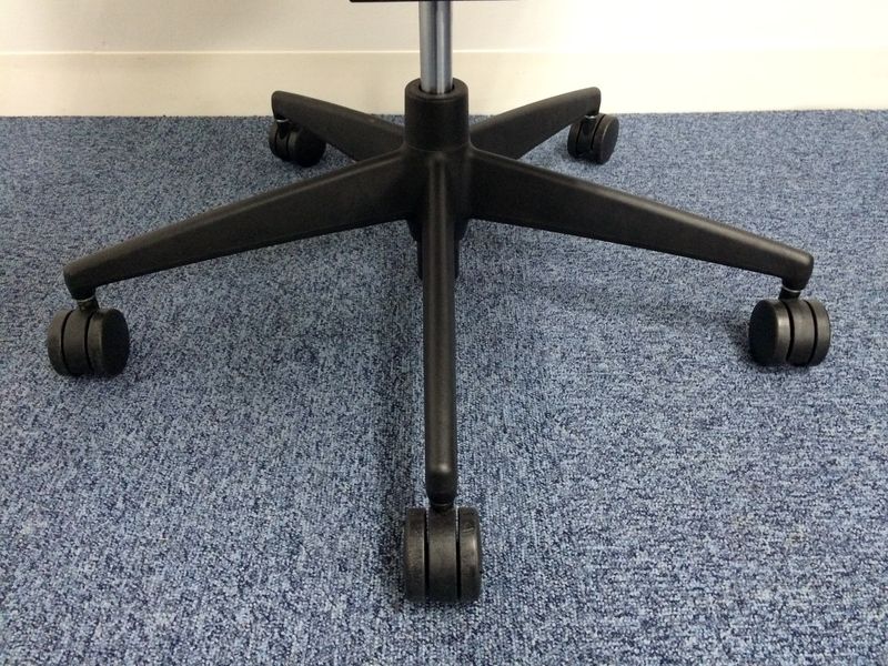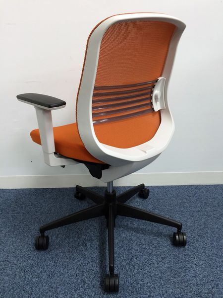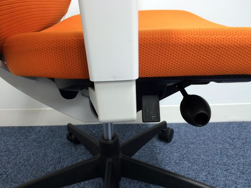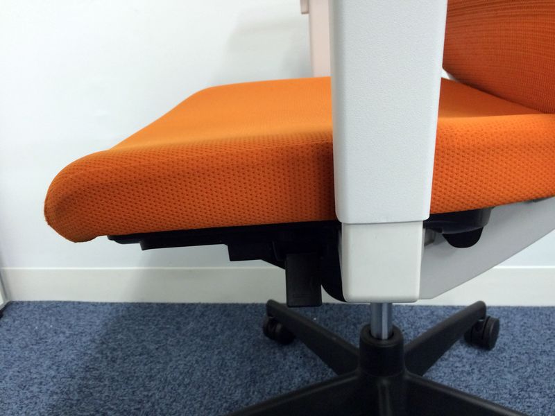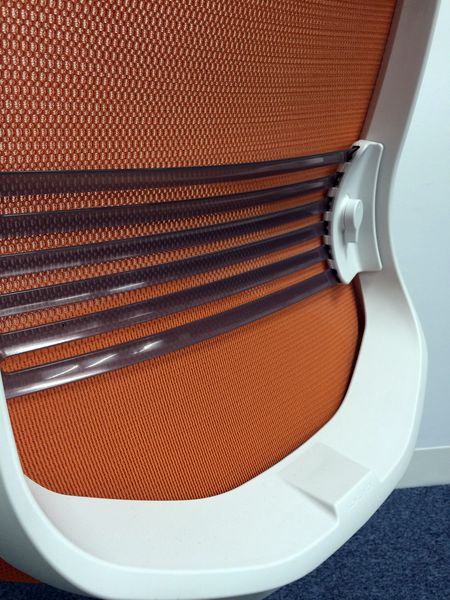 背もたれがメッシュのチェアは、構造上、外枠となるフレームが存在します。小さめのメッシュチェアは背中にフレームが当たったり、メッシュの弾性を十分に得ることができないので、一般にメッシュチェアは大型になりがちです。しかし、シロッコチェアは、フレームを横ではなく縦方向に厚くしたバーチカルフレームで強度を確保しており、 小さめのボディでありながらメッシュ面が広く作られています。