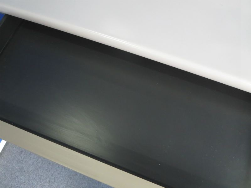 - 袖机のワゴンは、最下段がロング引出しになっており、従来より収納力120%アップ。