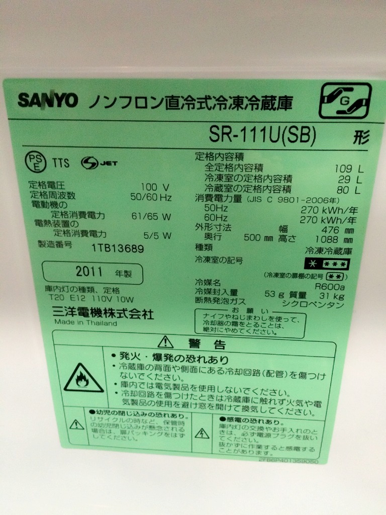 【中古】 SR-111U(SB) SANYO 冷蔵庫 168515
