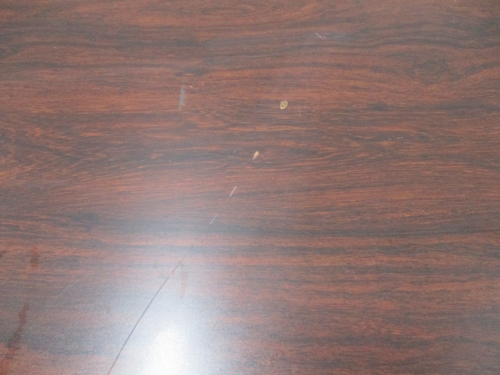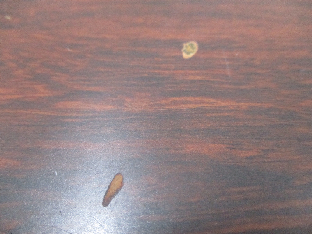 - かなり強い濃い黄ばみ・変色が商品全体にある。(例、天板、幕板、棚板、サイド部分、脚部等にある。)