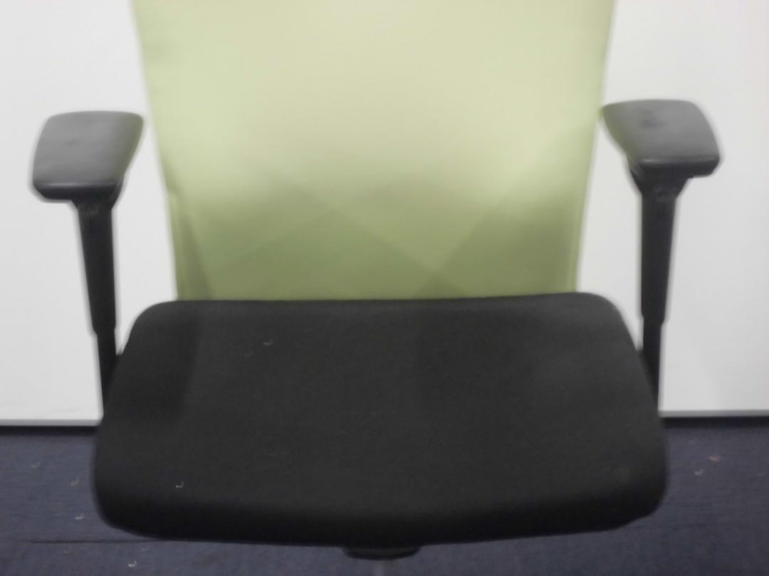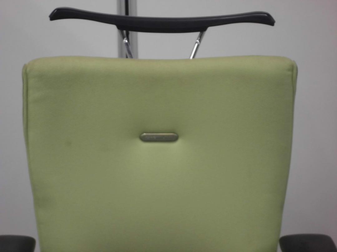 【快適な座り心地で作業効率アップ!】■オカムラ フィーゴチェア 可動肘付 シームレスタイプ ライムグリーン ハンガー付 ※肘に擦れ・削れ・欠けありのためお安く!
