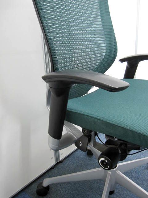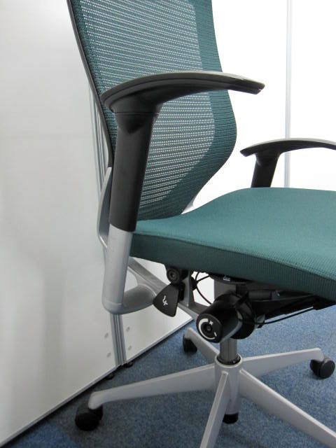 ・肘:アジャストアーム(可動肘):アームレストはラチェット式で、座ったままの姿勢で軽く持ち上げるだけで高さ調節(100mm)が可能。