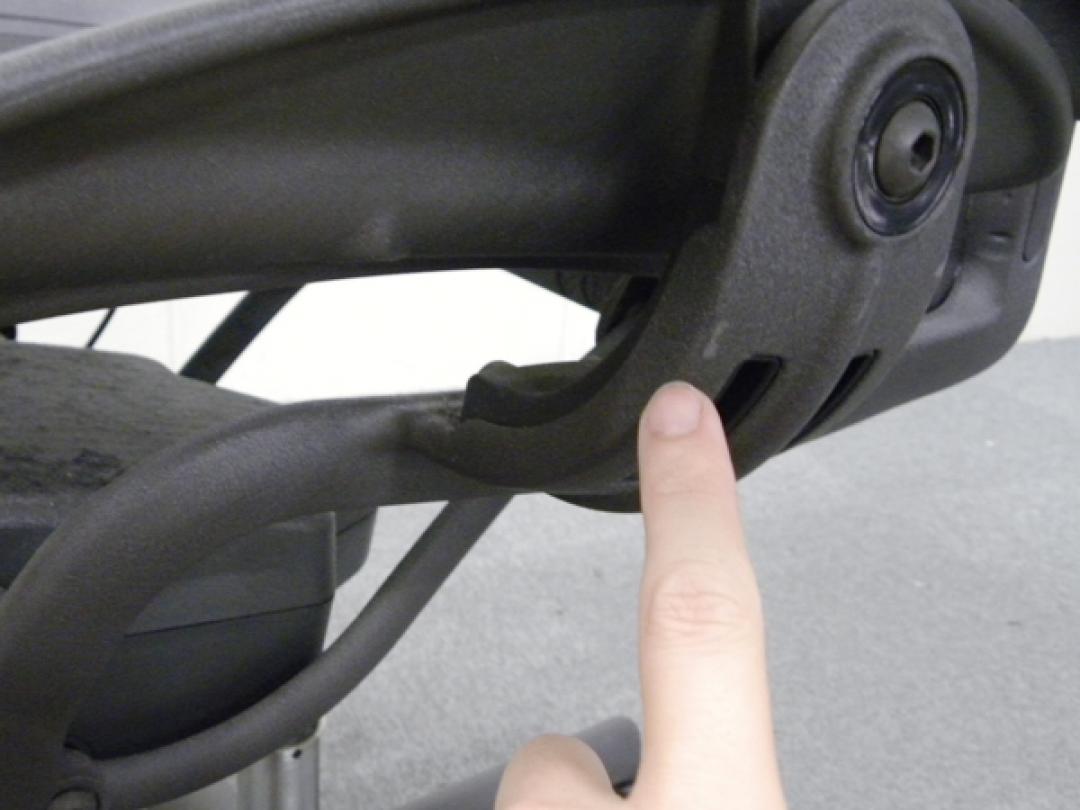 - 背もたれの裏にあるランバーサポート(パッド) の厚さは裏表で調節。上下の移動で、適切な高さ に調節できます。