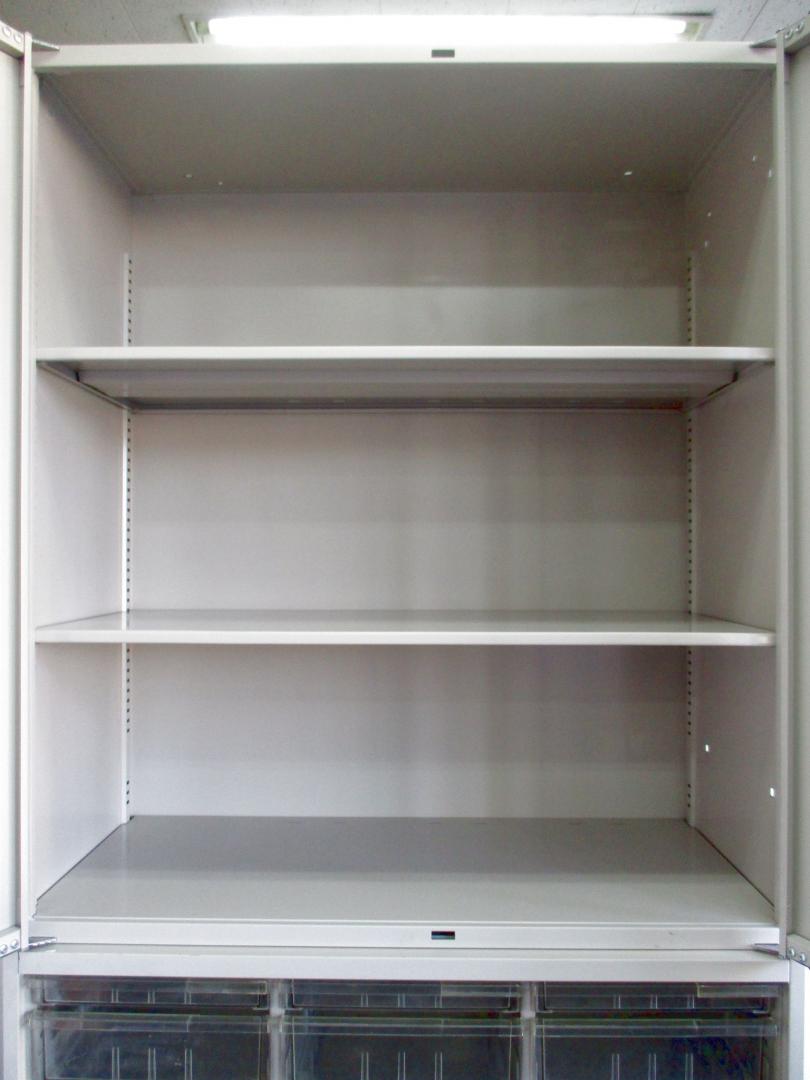 上段は両開きの書庫で棚板のレイアウトが自由に出来ます。