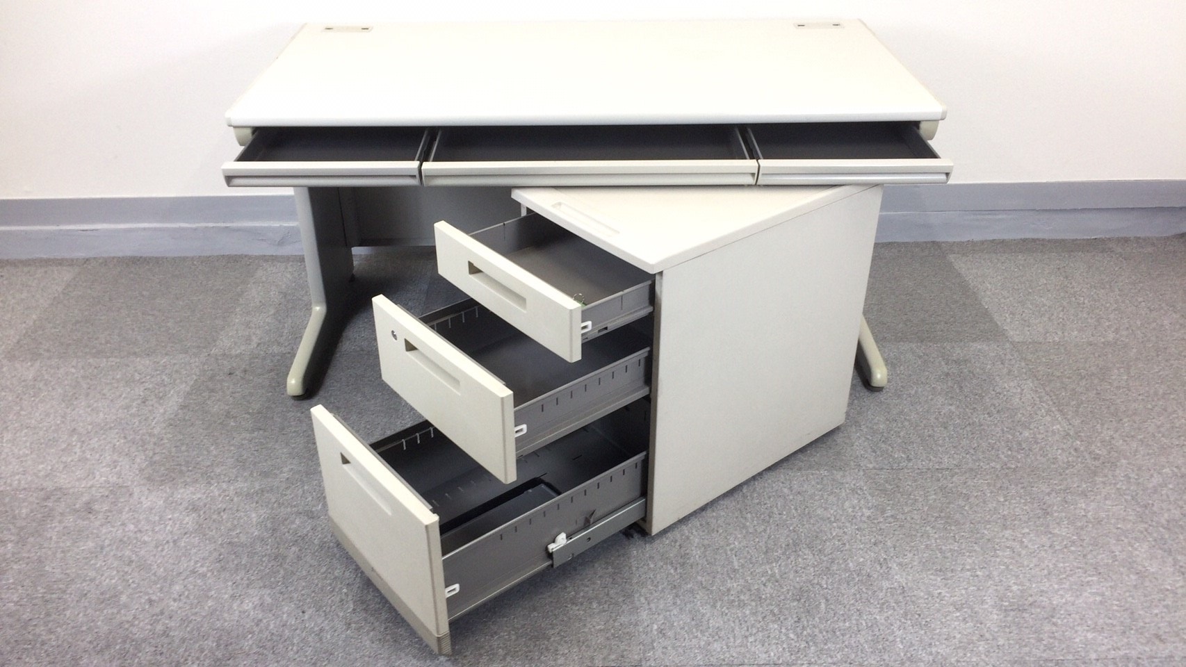 - 袖机のワゴンは、最下段がロング引出しになっており、従来より収納力120%アップ。