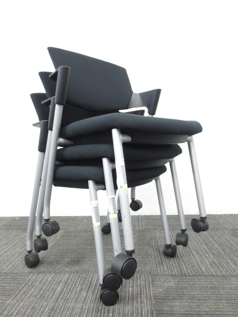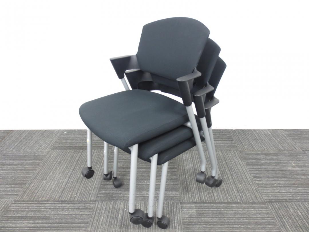 【シンプルスマートなスタッキングチェア!分厚いクッションで長時間でも快適な座り心地!】■スタッキングチェア 肘付ミーティングチェア ■固定肘 ■キャスター付 ■ブラック ■背面樹脂/コクヨ(KOKUYO/プロッティ
