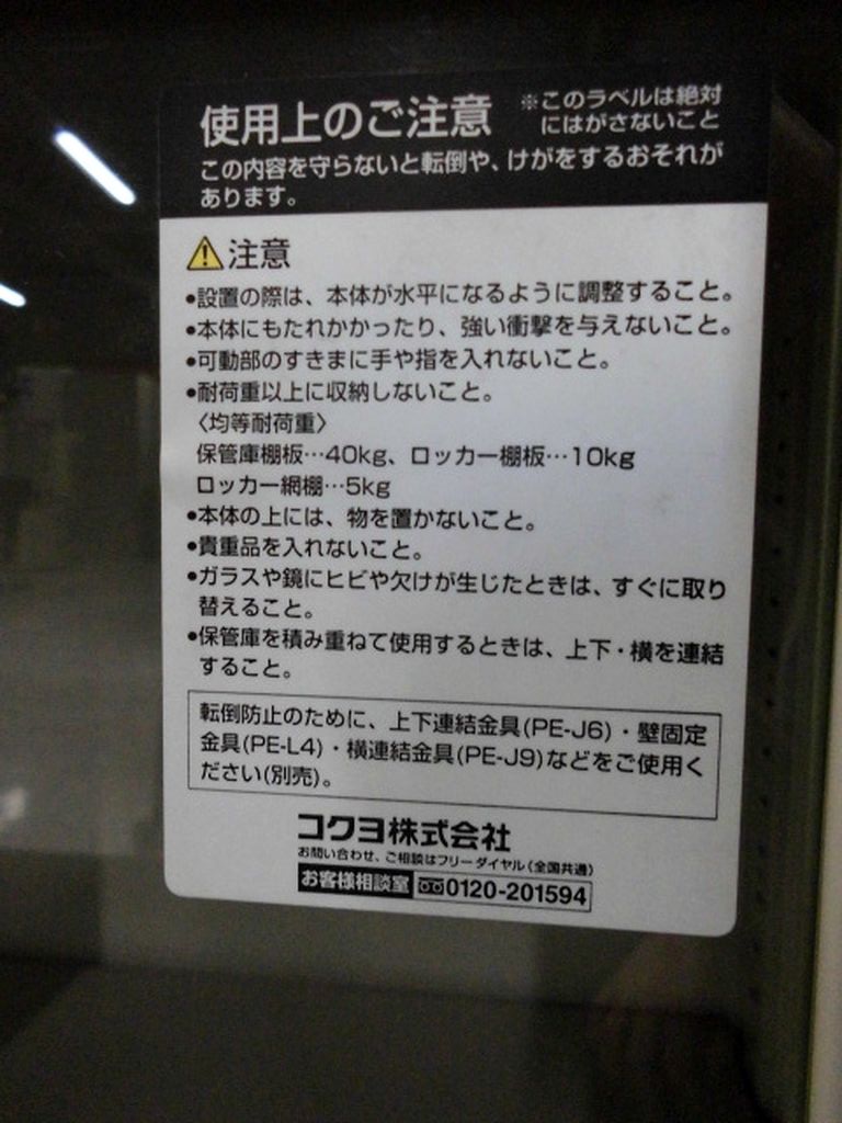 - 一部不具合ありそ引出の開閉不可、施錠不可、棚板無しといったの書庫の本来の効用を果たすための機能以外の一部が使用不可(例、扉、引出の開閉がしづらいなどがある。 )