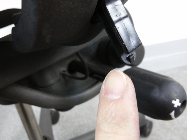 - ノブを+方向に回すと背もたれのリクライニング が硬くなり、-方向に回すと柔らかくなります。