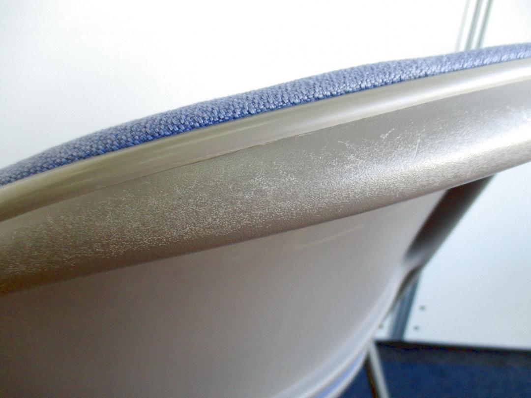 - かなり強い濃い黄ばみ・変色が商品全体にある。(例、座面・背もたれ、脚部等にある。)