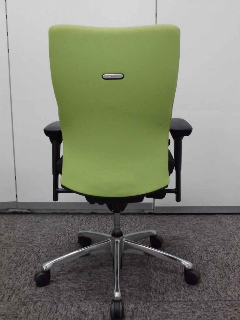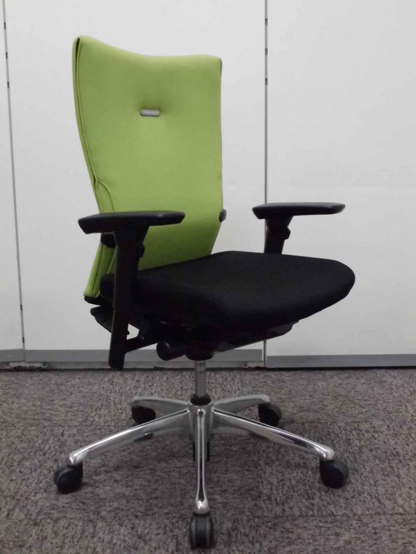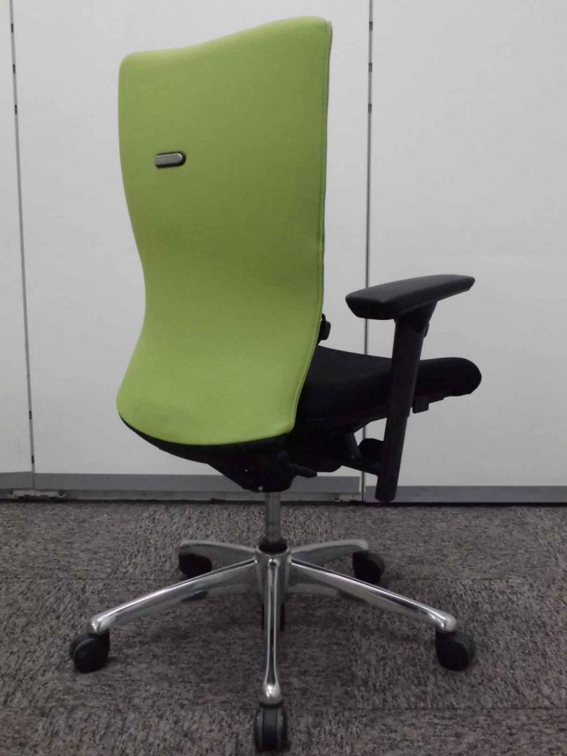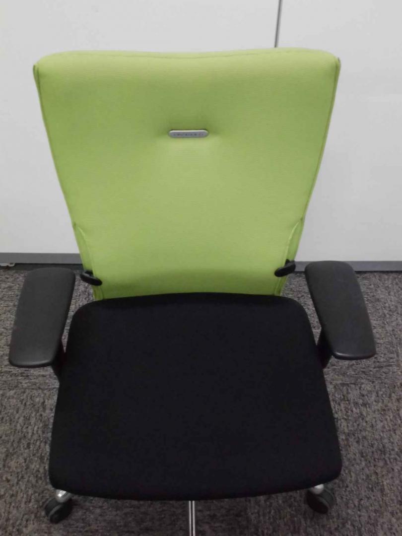 オカムラ製フィーゴチェア■明るいライムグリーン■サイドファスナータイプ・コートハンガー・ランバーサポート・可動肘付き!- 大阪梅田本店