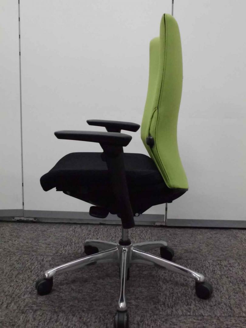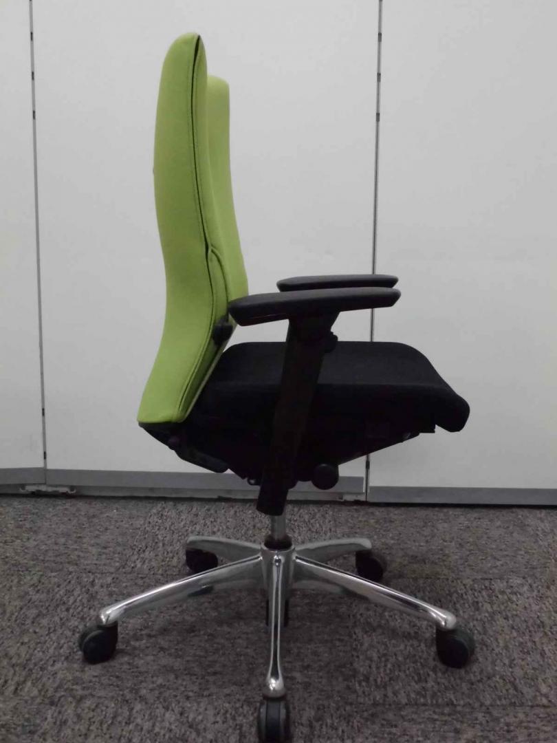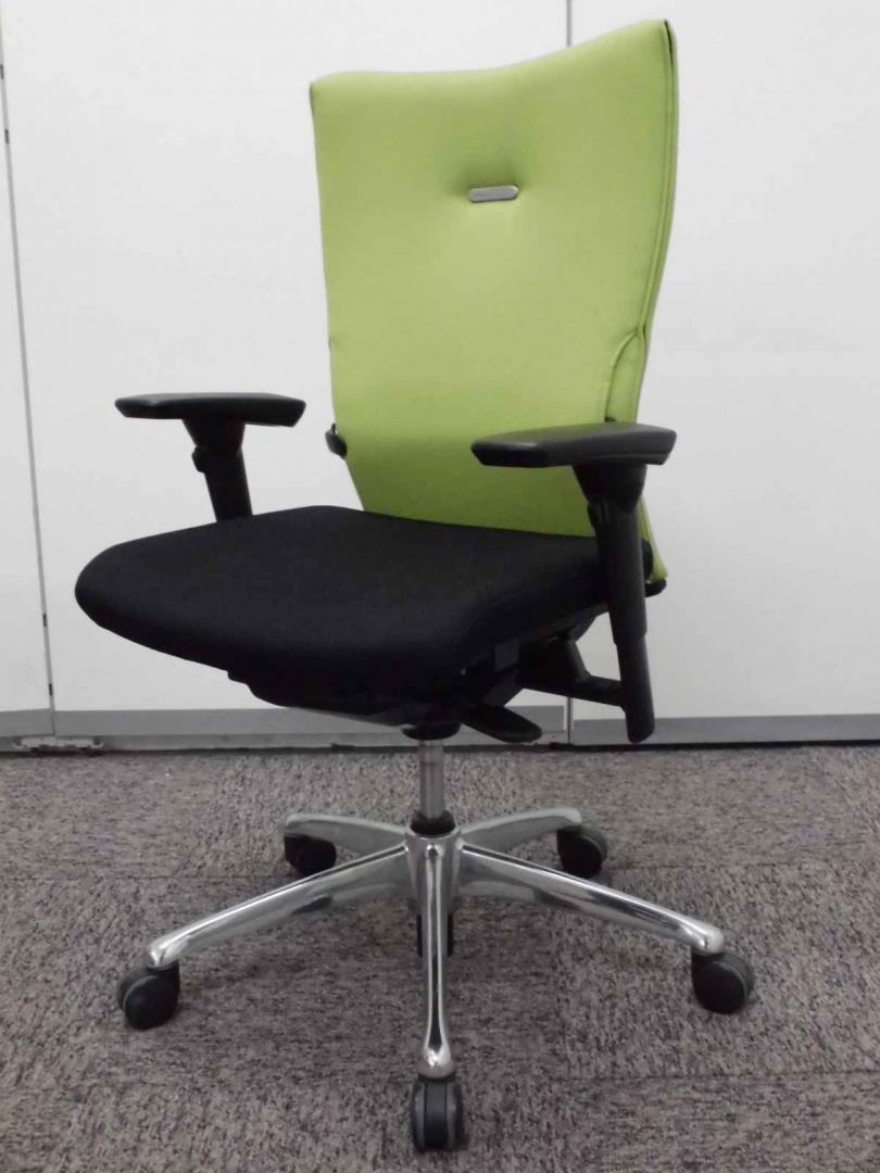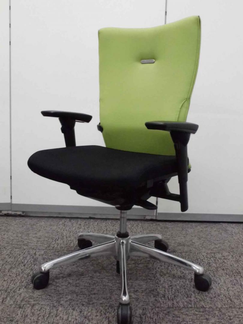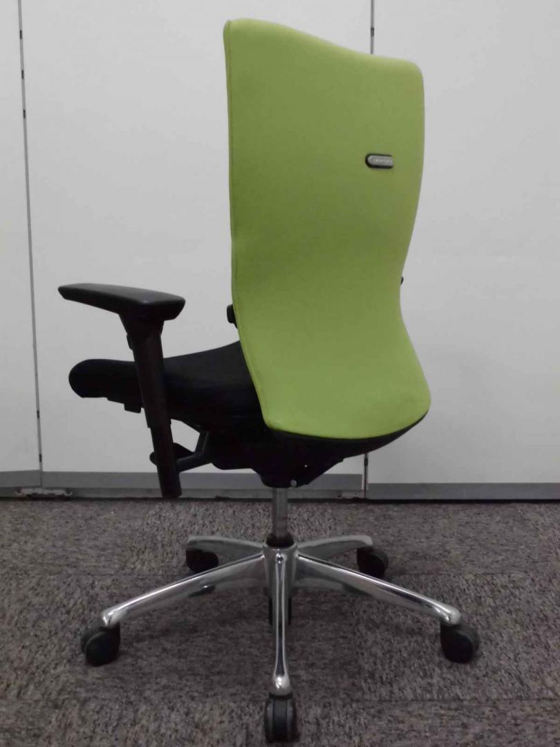 オカムラ製フィーゴチェア■明るいライムグリーン■サイドファスナータイプ・コートハンガー・ランバーサポート・可動肘付き!- 大阪梅田本店