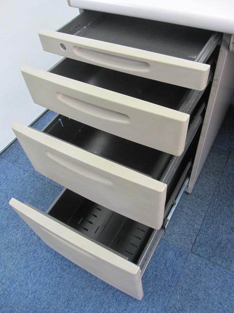 - 袖机のワゴンは、最下段がロング引出しになっており、従来より収納力120%アップ。