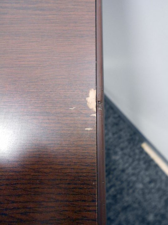 - かなり強い濃い黄ばみ・変色が商品全体にある。(例、天板、幕板、棚板、サイド部分、脚部等にある。)