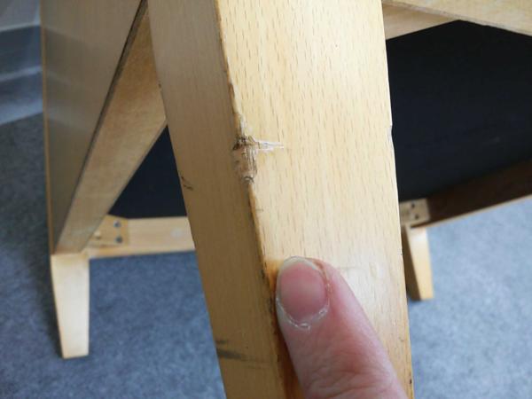 - あり黄ばみ・変色が広い範囲にうっすらある、または濃い黄ばみ・変色が一部ある。(例:三人用ソファ、二人用ソファ、一人用ソファの場合、背もたれ、肘かけ、座面等、 センターテーブルの場合、天板、脚にある。)