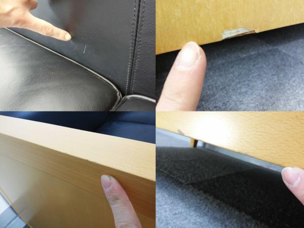 - 目立つ箇所ありソファの場合、破け、ホツレ、へたり、しわ等が多数または深い破け、ホツレ、へたり、しわ等一部ある。(例、背もたれ、肘かけ、座面等にある。)センタ>ーテーブルの場合、傷・凹みが多数または深い傷・凹みが一部ある。(例、天板、脚にある。)