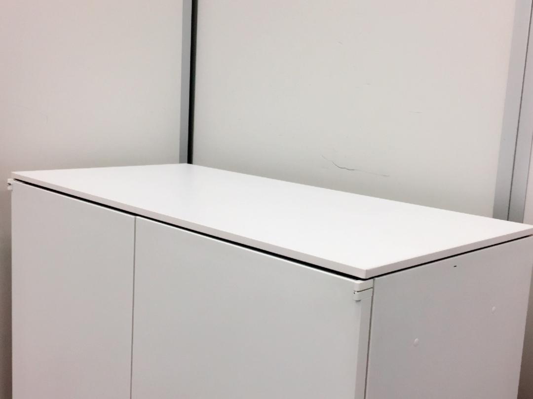 【オフィスの書類をスッキリ整理!取っ手がどの方向からでも開くマルチハンドル!】■オカムラ(okamura)製 レクトラインシリーズ 両開き書庫 ローキャビネット ■本体色:ホワイト ■シリンダー錠 ■ナチュラル天板付き