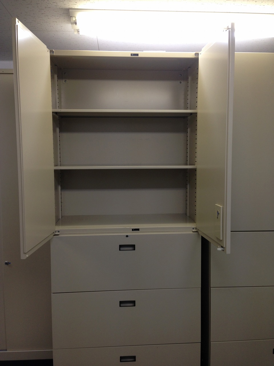 - 一部不具合ありそ引出の開閉不可、施錠不可、棚板無しといったの書庫の本来の効用を果たすための機能以外の一部が使用不可(例、扉、引出の開閉がしづらいなどがある。 )
