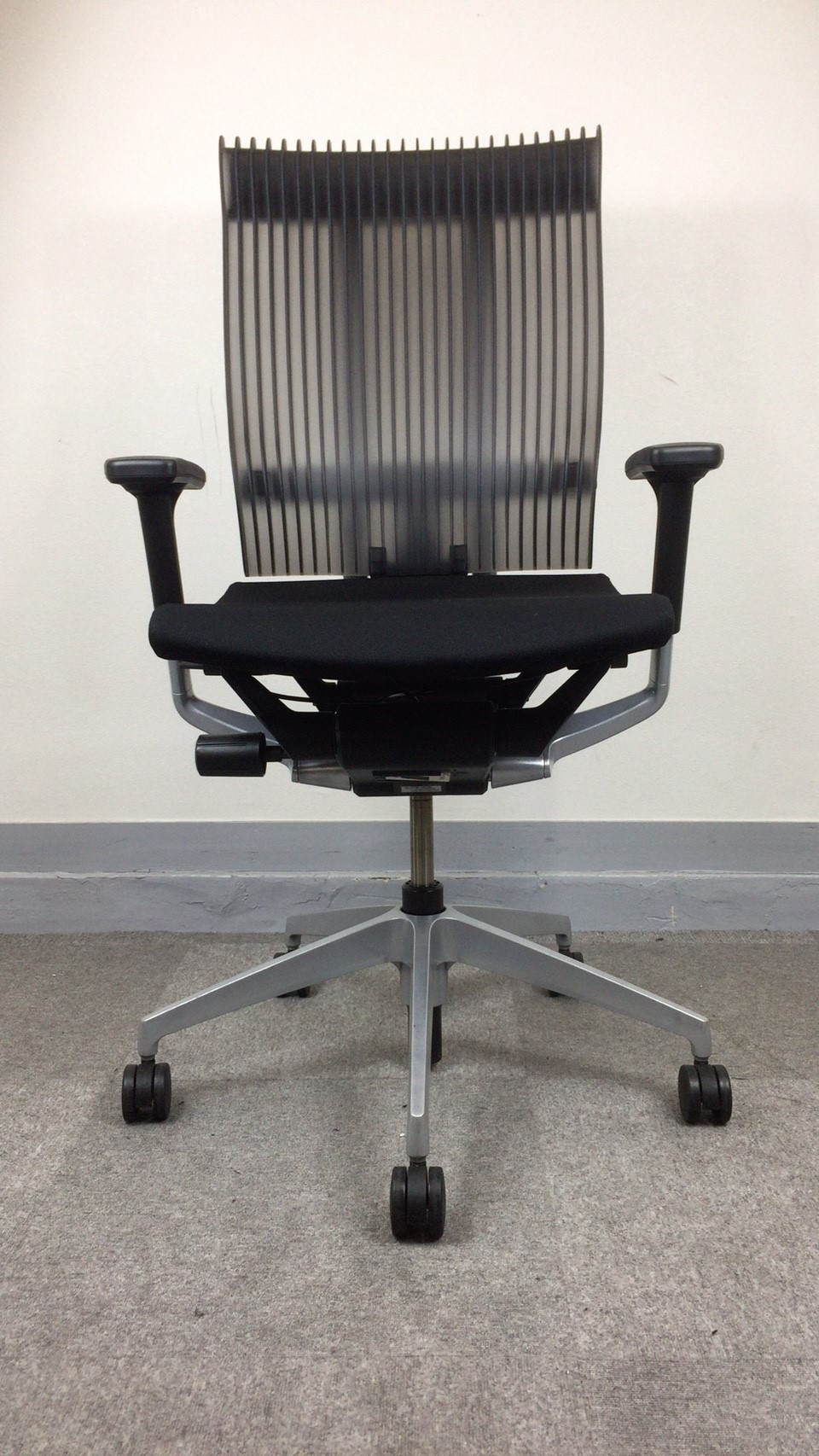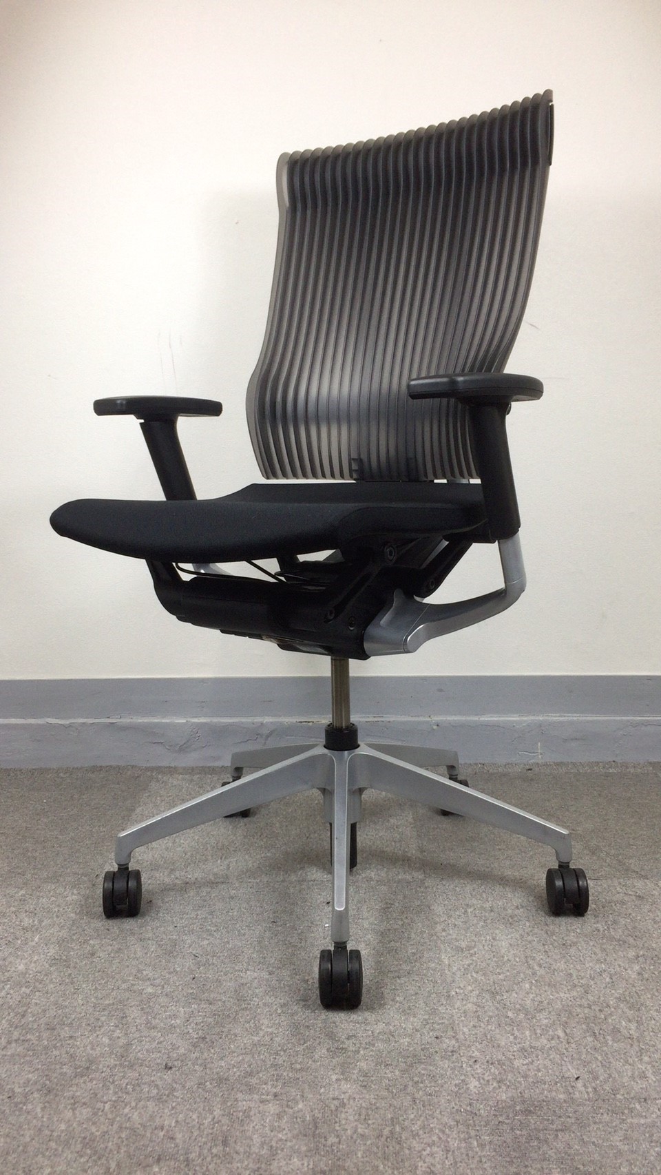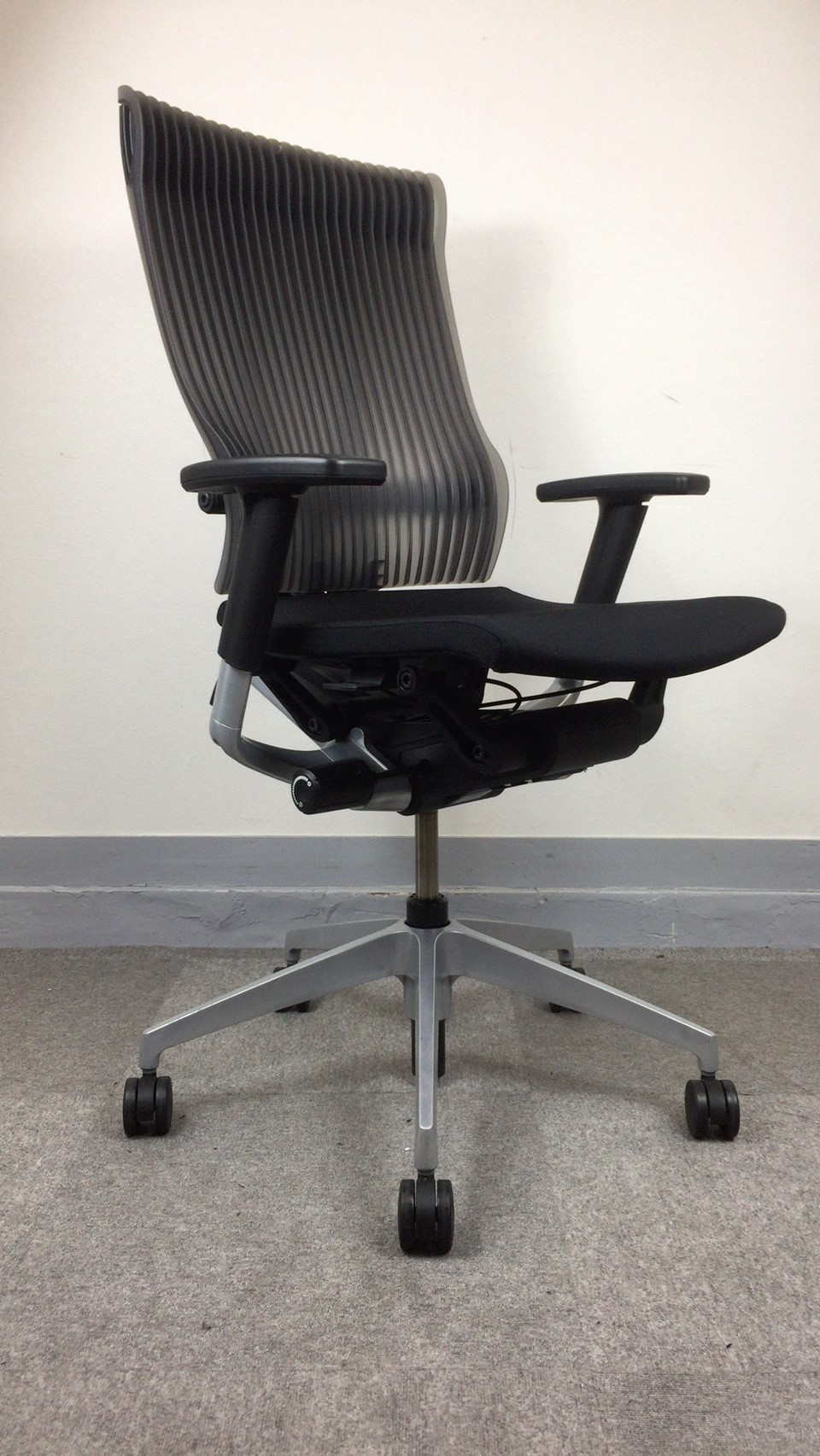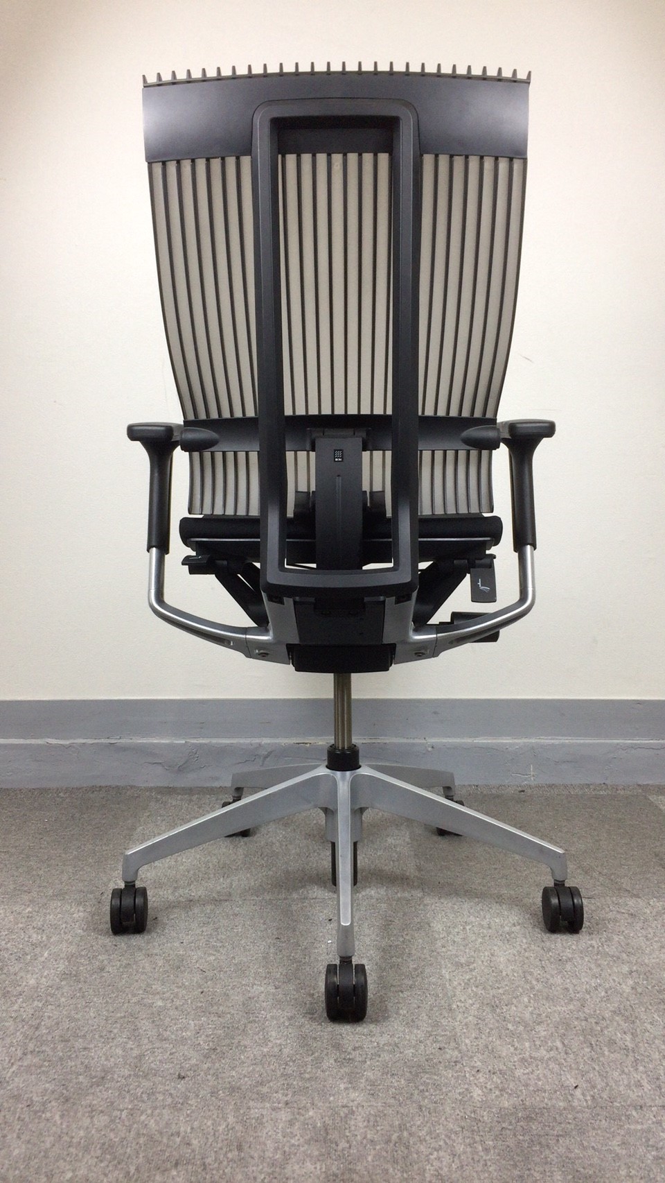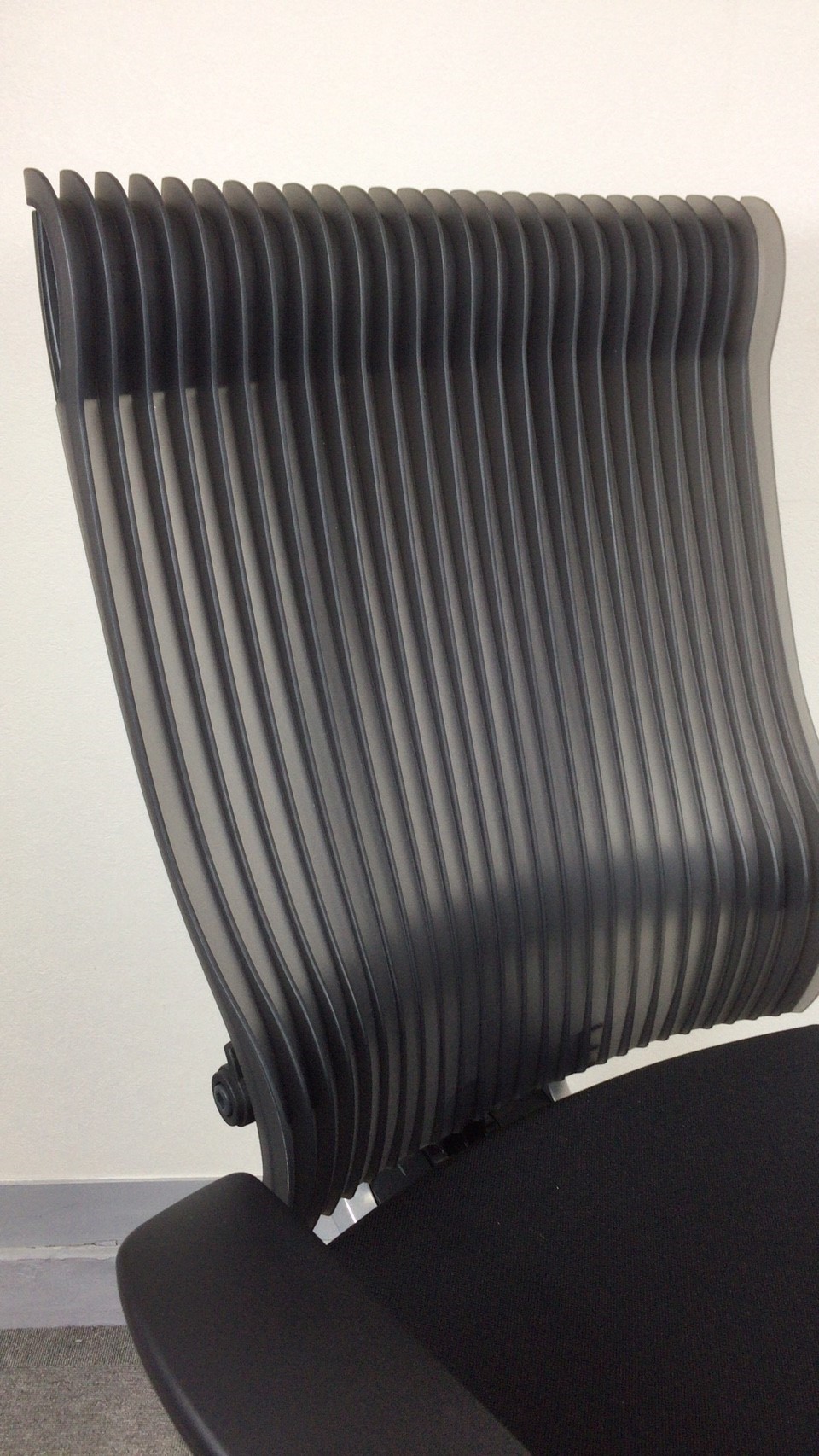 見た目は少し硬そうに見えるエラストマー素材ですが、座ってみると程よいしなり具合のやわらかな座り心地で、背中が痛くなるようなことはまるでありません。面ではなく線で支えることで、背面の通気性の良さは抜群です。