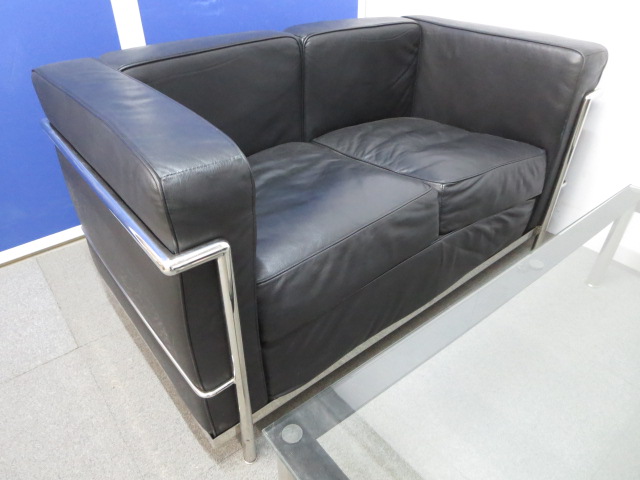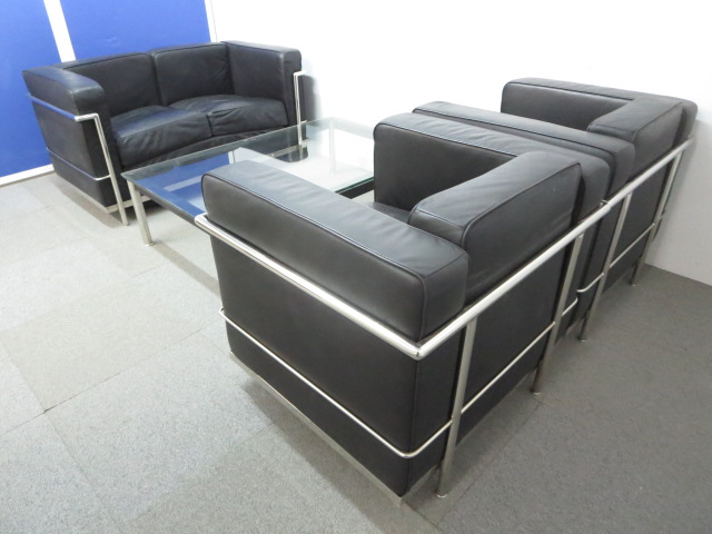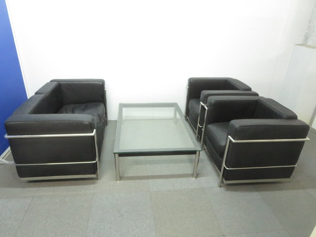 ■Le Corbusier(ル・コルビジェ) ■応接セット(2人掛ソファ×1、アームチェア×2、ガラスローテーブル×1)【デザイナーズ家具・リプロダクト】- 川崎店