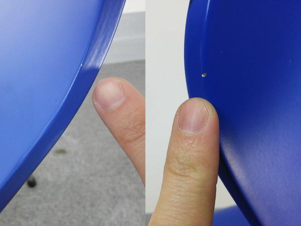 - あり黄ばみ・変色が広い範囲にうっすらある、または濃い黄ばみ・変色が一部ある。(例、座面・背もたれ、脚部等にある。)
