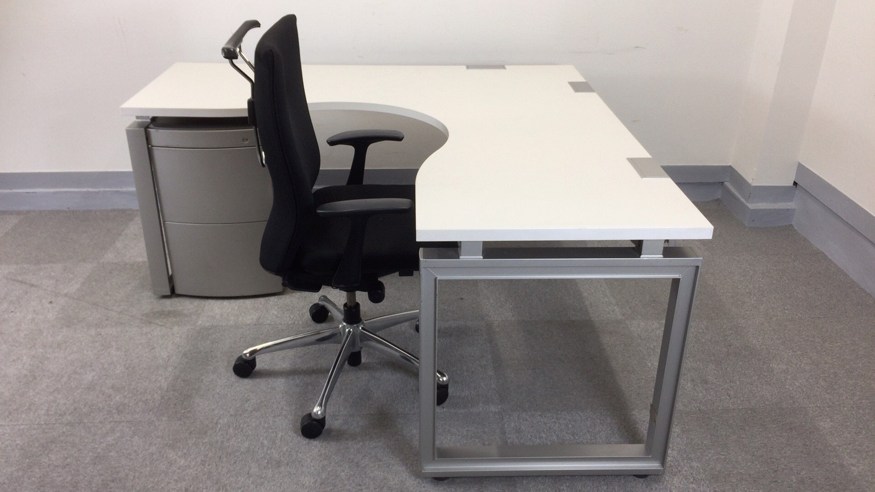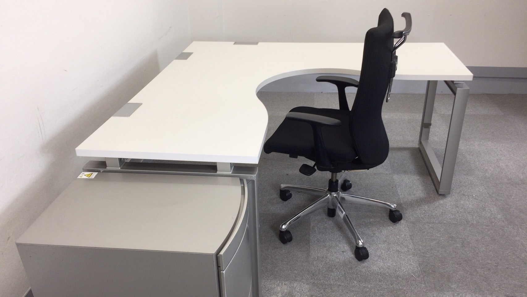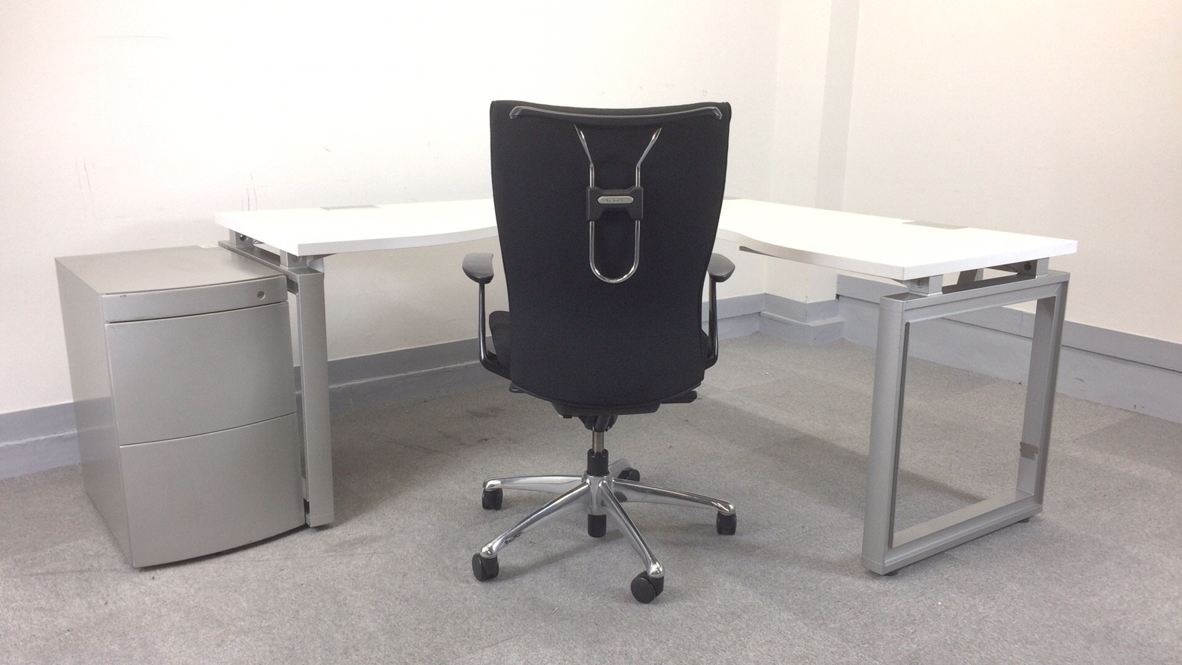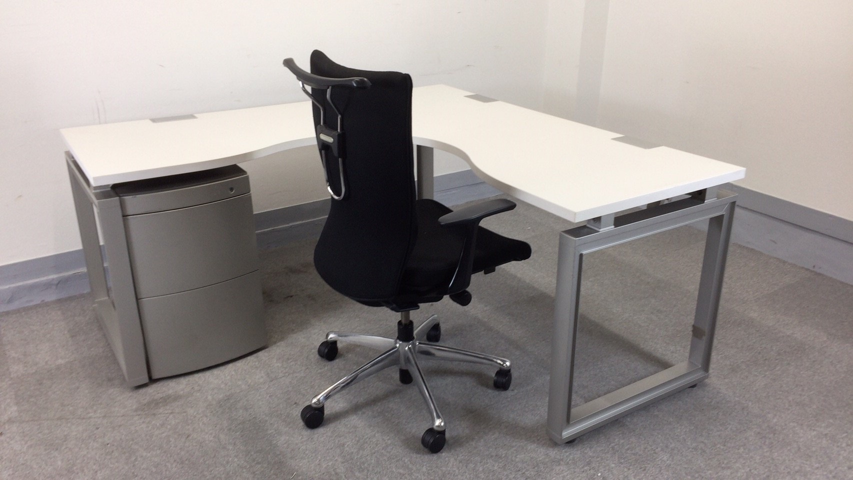 L字デスク、ワゴンとハイクラスオフィスチェアの組み合わせです。