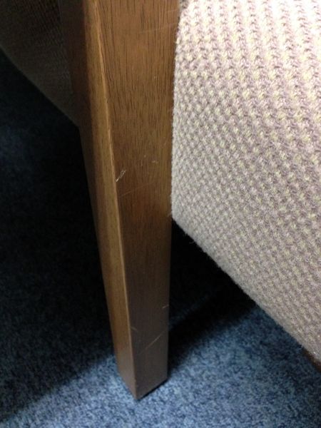 - あり黄ばみ・変色が広い範囲にうっすらある、または濃い黄ばみ・変色が一部ある。(例:三人用ソファ、二人用ソファ、一人用ソファの場合、背もたれ、肘かけ、座面等、 センターテーブルの場合、天板、脚にある。)