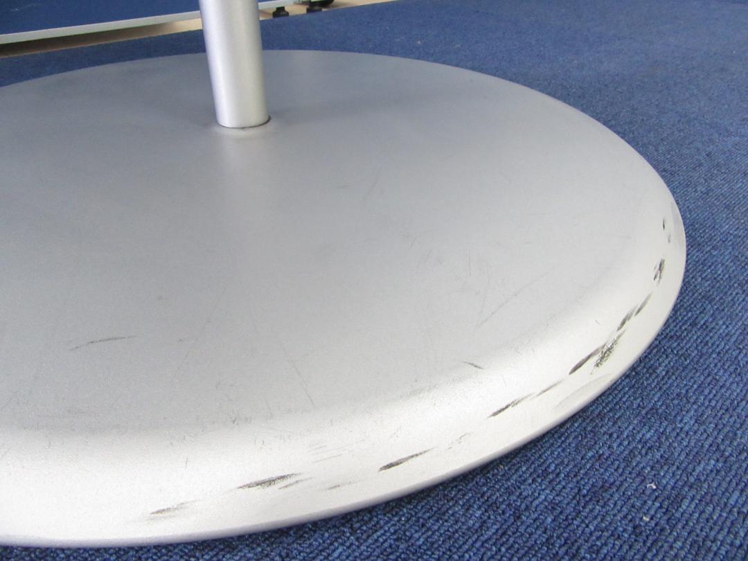 - 一部不具合あり天板歪み、アジャスター無し、キャスター使用不可ようなそのテーブルの本来の効用を果たすための機能以外の一部が使用不可な状態。(例、キャスターロッ ク機能使用不可、棚板無し等がある。)