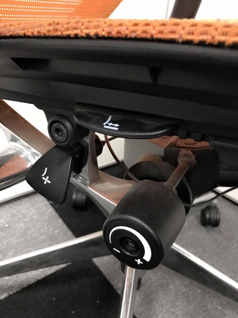 座面のすぐ右下にあるレバーの操作にて、座面位置の上下調整(100mm)が可能です。