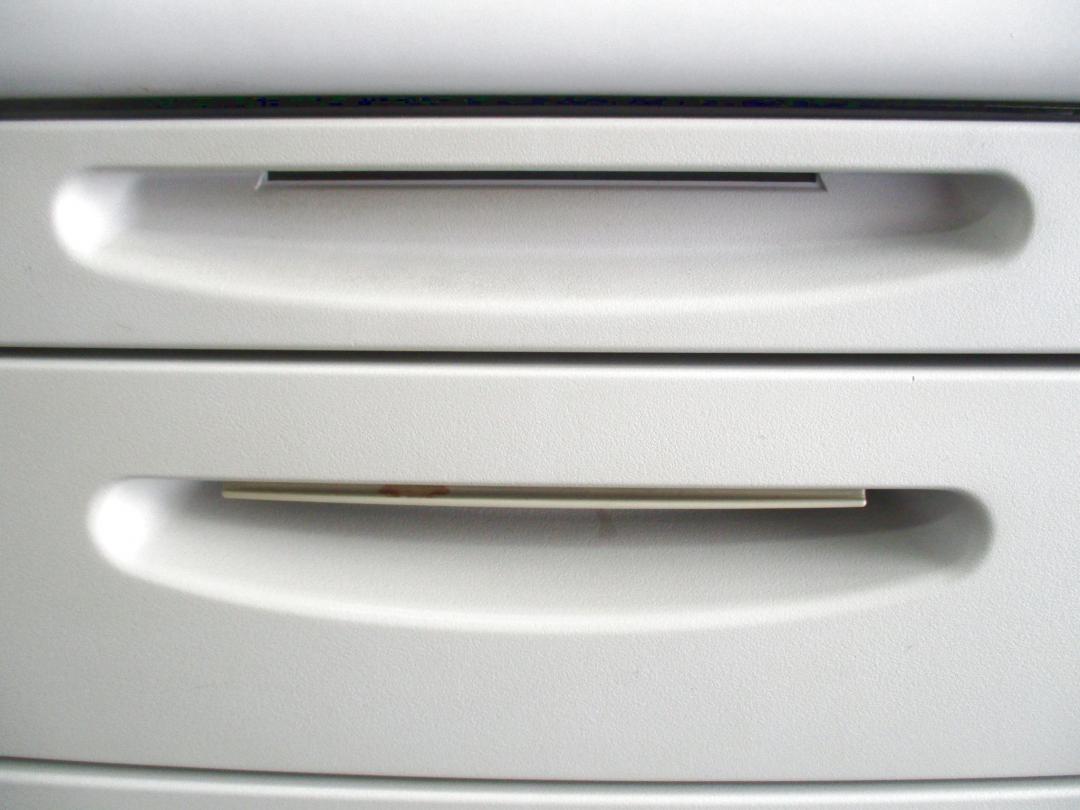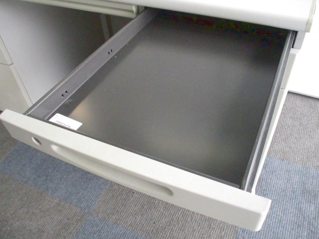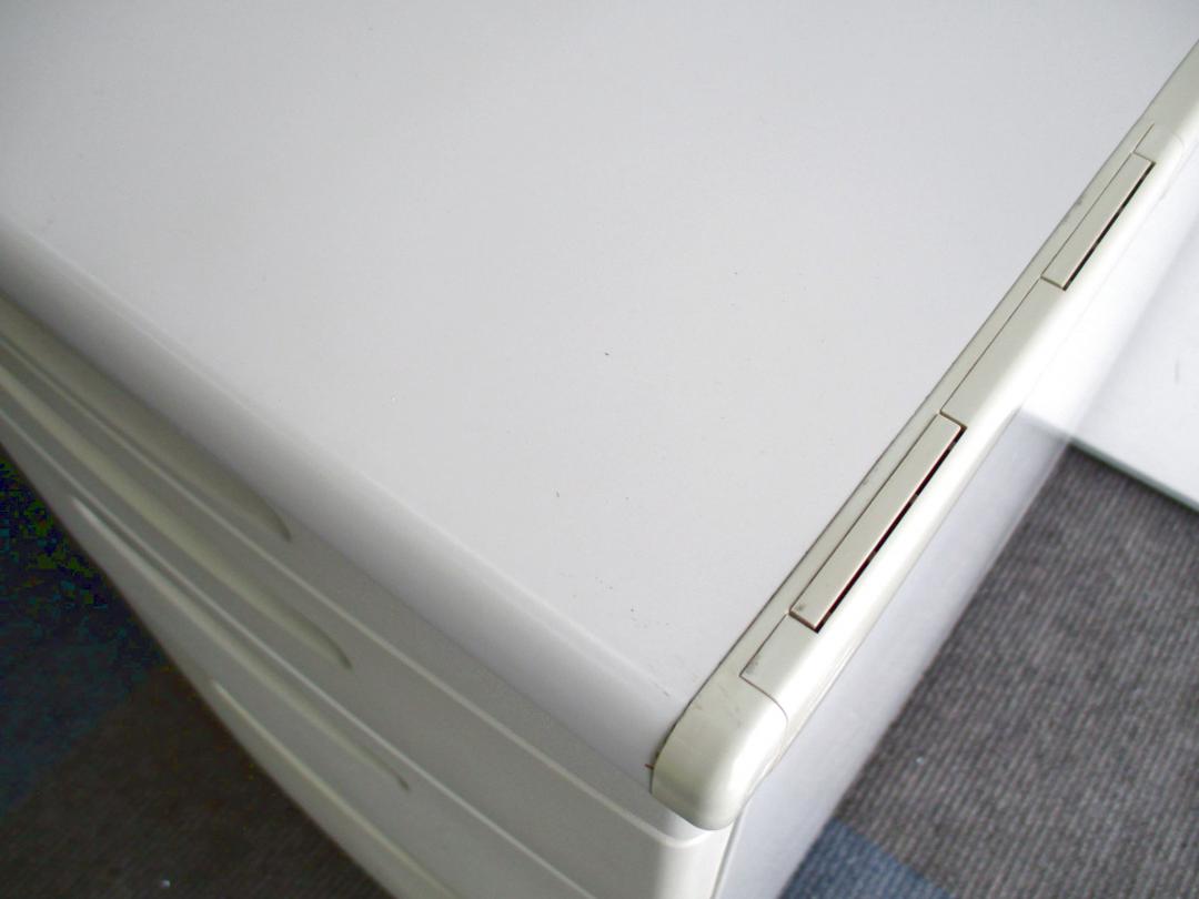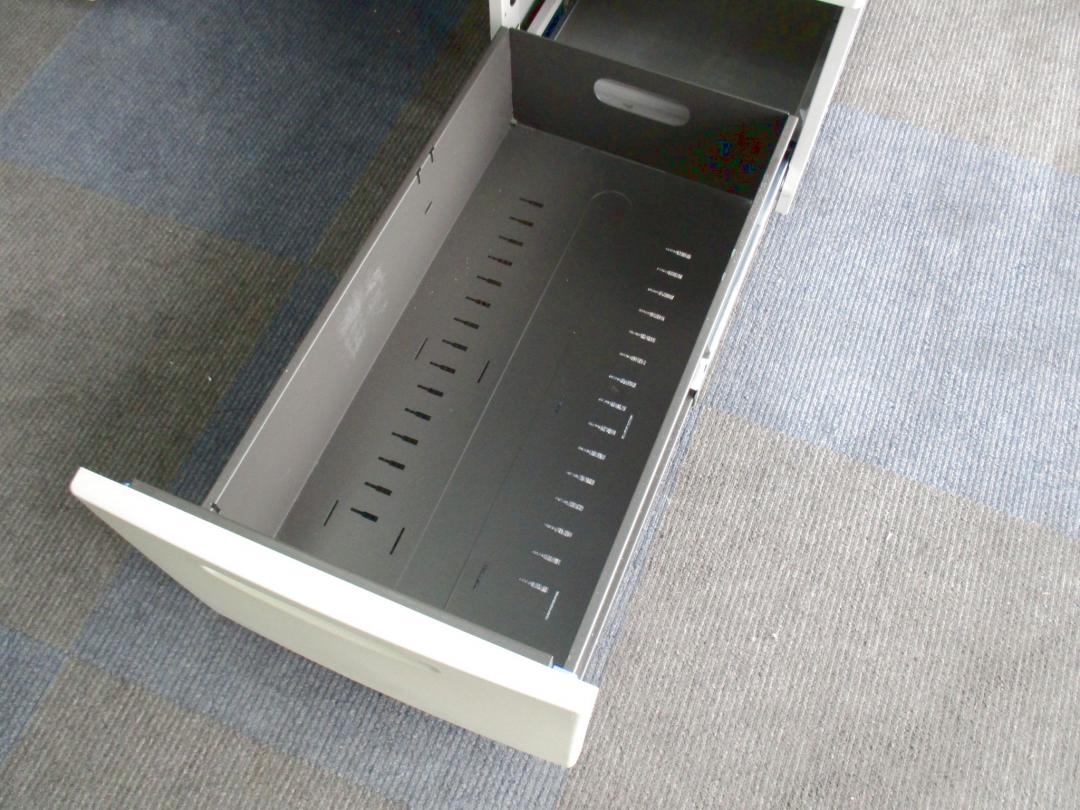 - 袖机のワゴンは、最下段がロング引出しになっており、従来より収納力120%アップ。