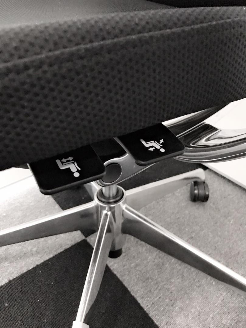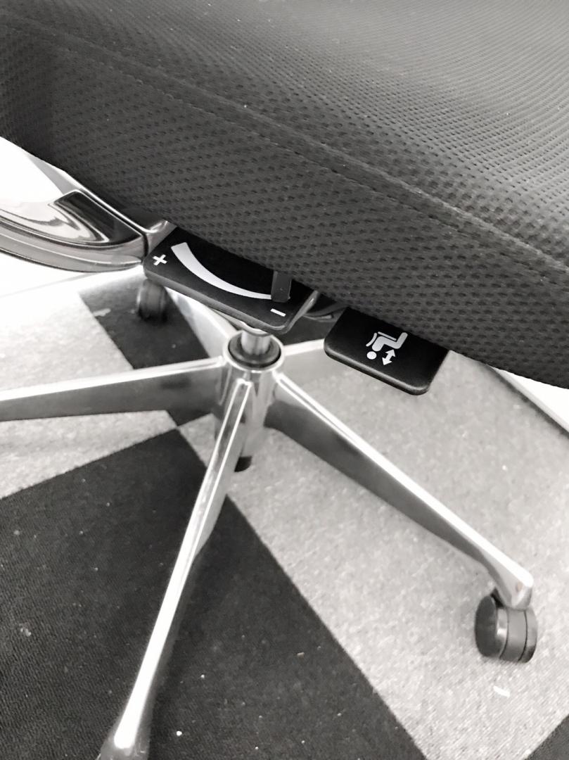 座面の高さや前後などの基本的な調整レバーが座面裏の前方に集約されており、姿勢を変えずに調節ができます。