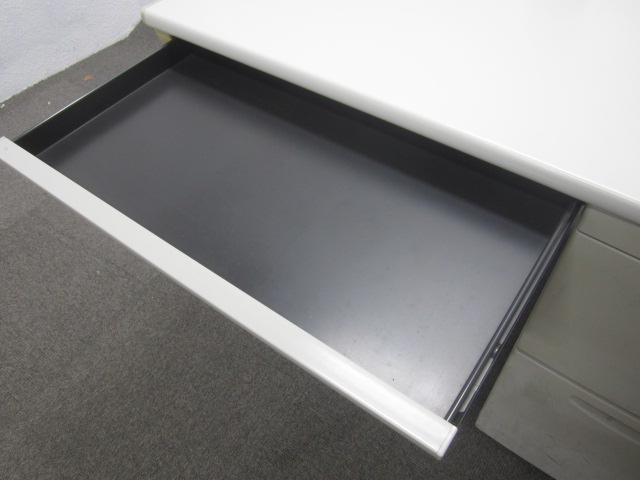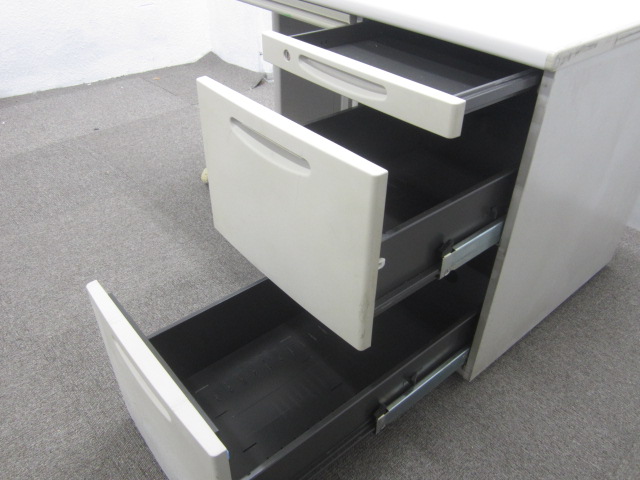 - 袖机のワゴンは、最下段がロング引出しになっており、従来より収納力120%アップ。