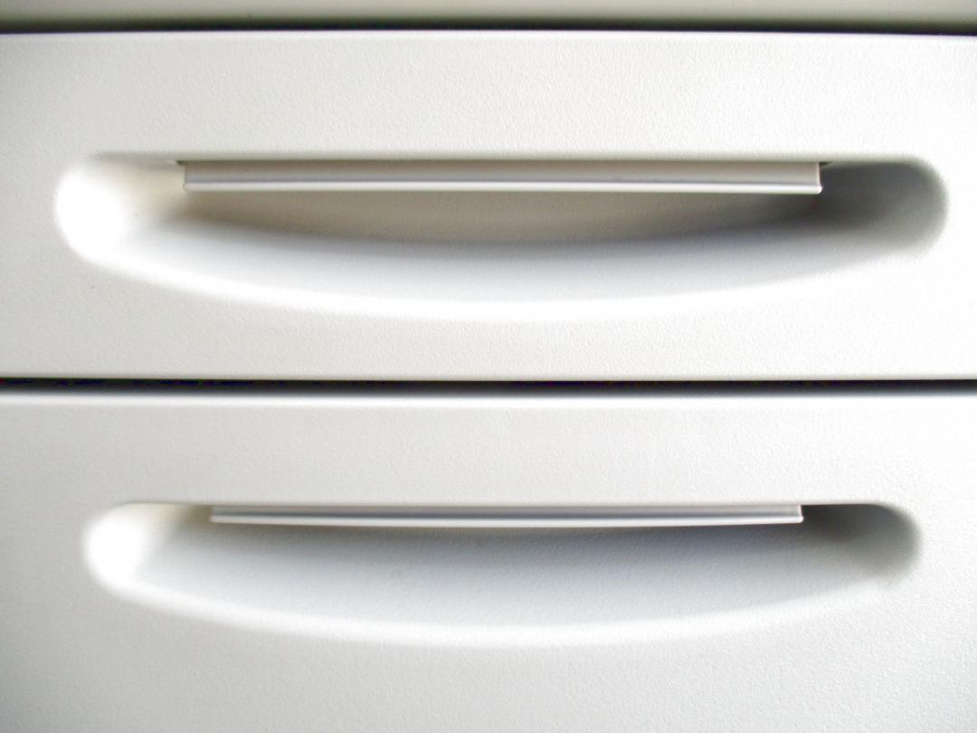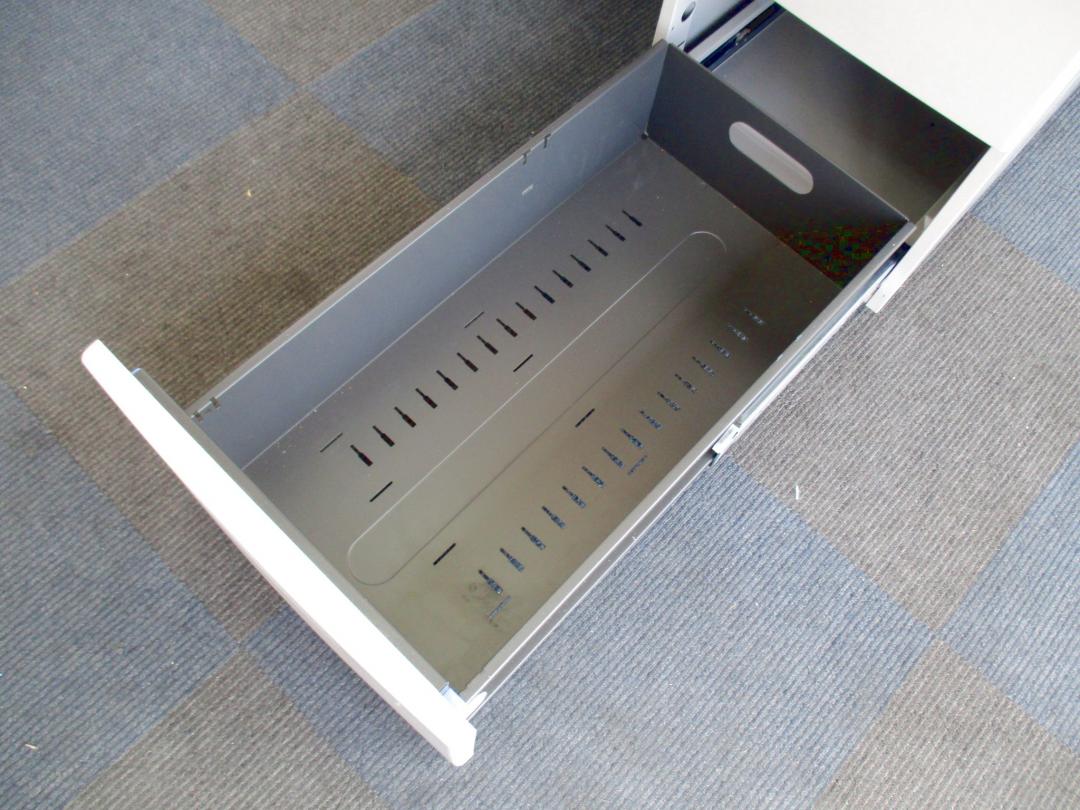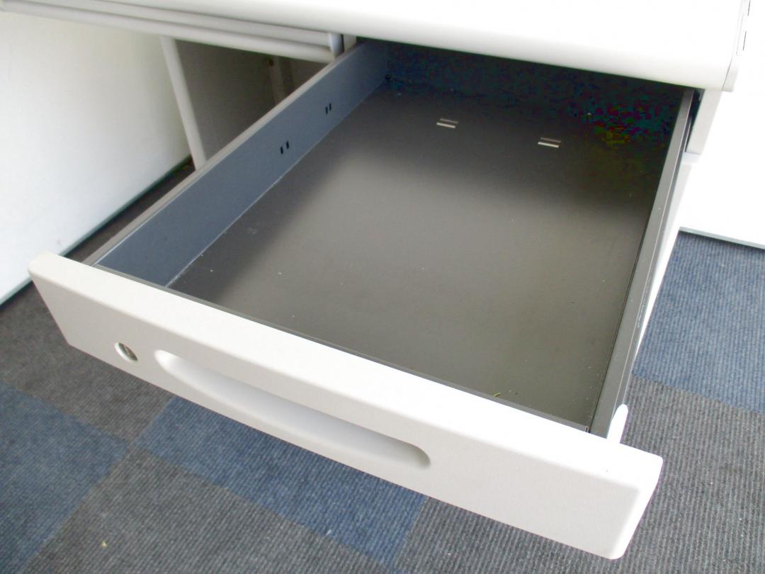 - 袖机のワゴンは、最下段がロング引出しになっており、従来より収納力120%アップ。