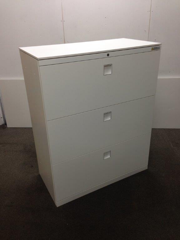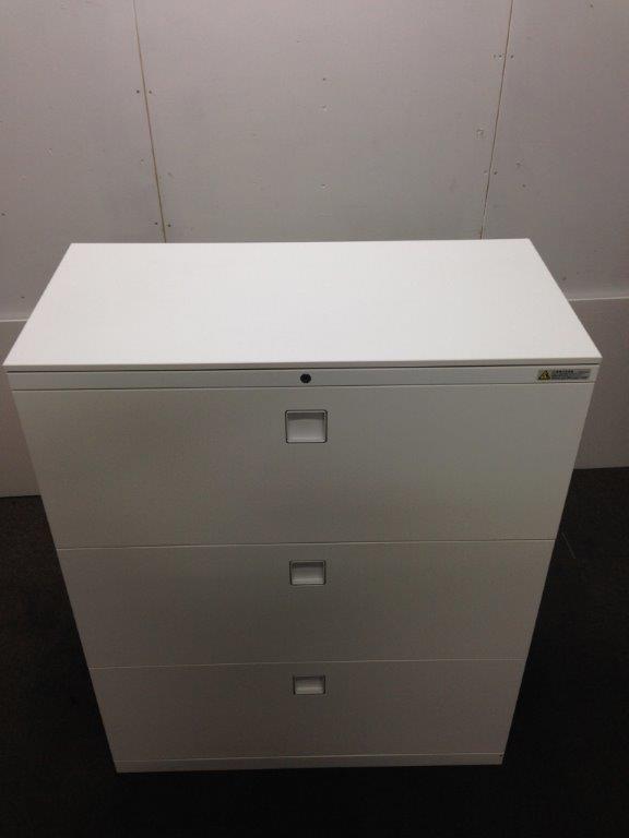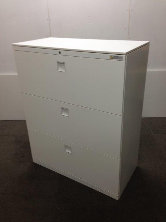 オカムラ レクトライン 3段ラテラル書庫 ホワイト天板 シリンダー錠 鍵付き ※取っ手部分に若干日焼けあり